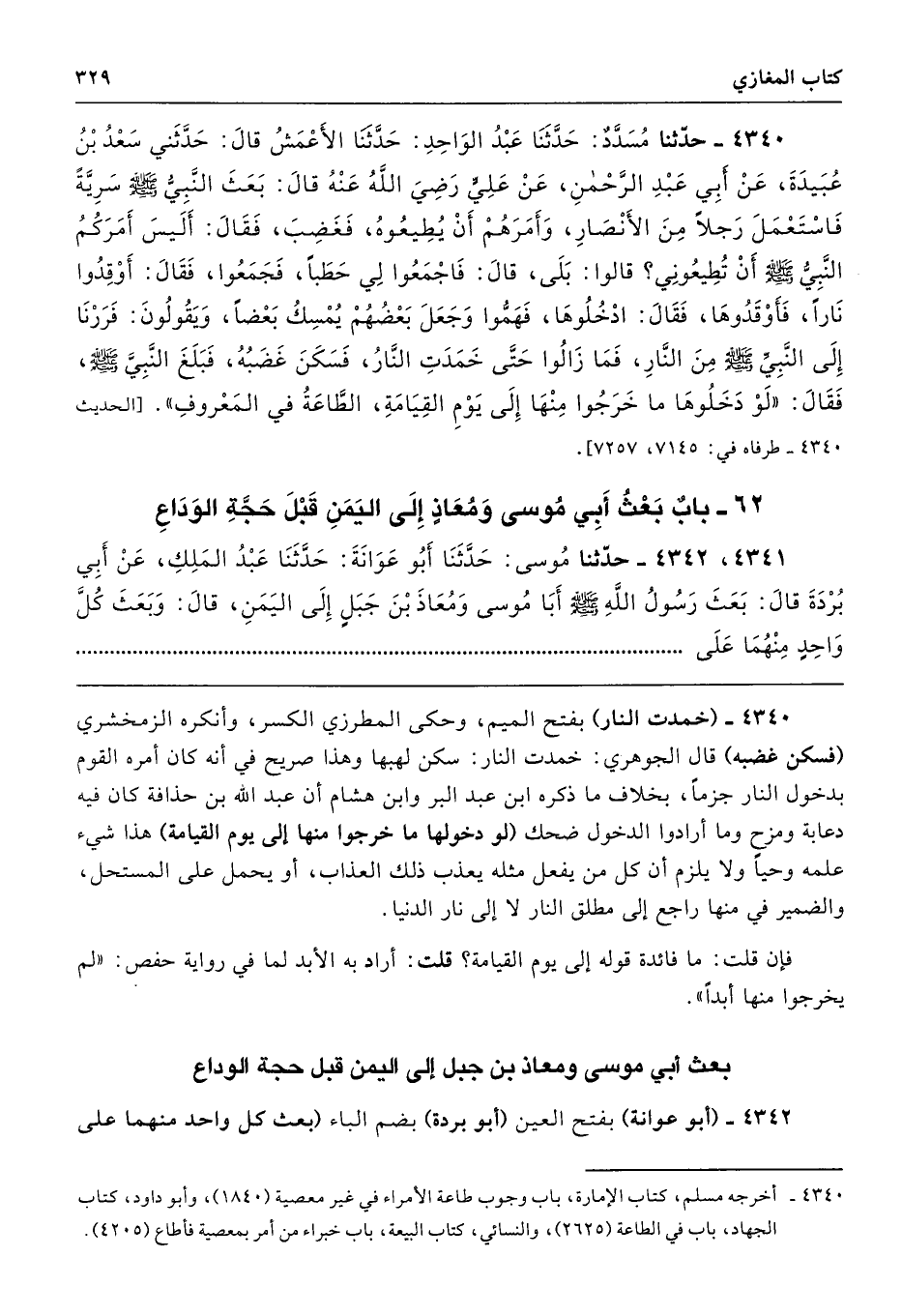 4340 - حَدَّثَنَا مُسَدَّدٌ حَدَّثَنَا عَبْدُ الْوَاحِدِ حَدَّثَنَا الأَعْمَشُ قَالَ حَدَّثَنِى سَعْدُ بْنُ عُبَيْدَةَ عَنْ أَبِى عَبْدِ الرَّحْمَنِ عَنْ عَلِىٍّ - رضى الله عنه - قَالَ بَعَثَ النَّبِىُّ - صلى الله عليه وسلم - سَرِيَّةً فَاسْتَعْمَلَ رَجُلاً مِنَ الأَنْصَارِ، وَأَمَرَهُمْ أَنْ يُطِيعُوهُ، فَغَضِبَ فَقَالَ أَلَيْسَ أَمَرَكُمُ النَّبِىُّ - صلى الله عليه وسلم - أَنْ تُطِيعُونِى. قَالُوا بَلَى. قَالَ فَاجْمَعُوا لِى حَطَبًا. فَجَمَعُوا، فَقَالَ أَوْقِدُوا نَارًا. فَأَوْقَدُوهَا، فَقَالَ ادْخُلُوهَا. فَهَمُّوا، وَجَعَلَ بَعْضُهُمْ يُمْسِكُ بَعْضًا، وَيَقُولُونَ فَرَرْنَا إِلَى النَّبِيِّ - صلى الله عليه وسلم - مِنَ النَّارِ. فَمَا زَالُوا حَتَّى خَمَدَتِ النَّارُ، فَسَكَنَ غَضَبُهُ، فَبَلَغَ النَّبِىَّ - صلى الله عليه وسلم - فَقَالَ «لَوْ دَخَلُوهَا مَا خَرَجُوا مِنْهَا إِلَى يَوْمِ الْقِيَامَةِ، الطَّاعَةُ فِي الْمَعْرُوفِ». طرفاه 7145، 7257