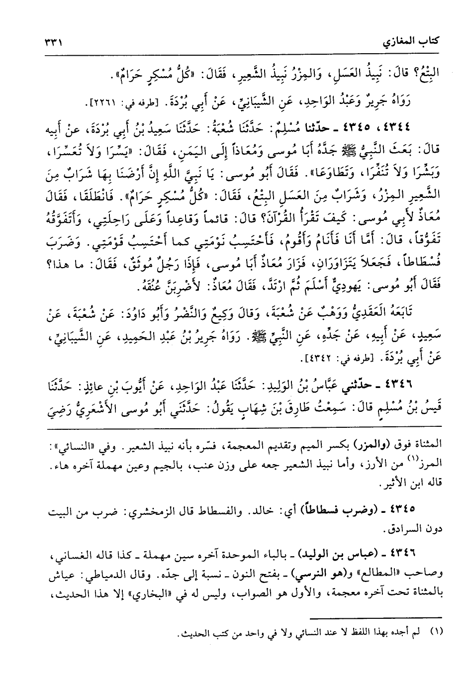 4346 - حَدَّثَنِى عَبَّاسُ بْنُ الْوَلِيدِ حَدَّثَنَا عَبْدُ الْوَاحِدِ عَنْ أَيُّوبَ بْنِ عَائِذٍ حَدَّثَنَا قَيْسُ بْنُ مُسْلِمٍ قَالَ سَمِعْتُ طَارِقَ بْنَ شِهَابٍ يَقُولُ حَدَّثَنِى أَبُو مُوسَى الأَشْعَرِىُّ - رضى