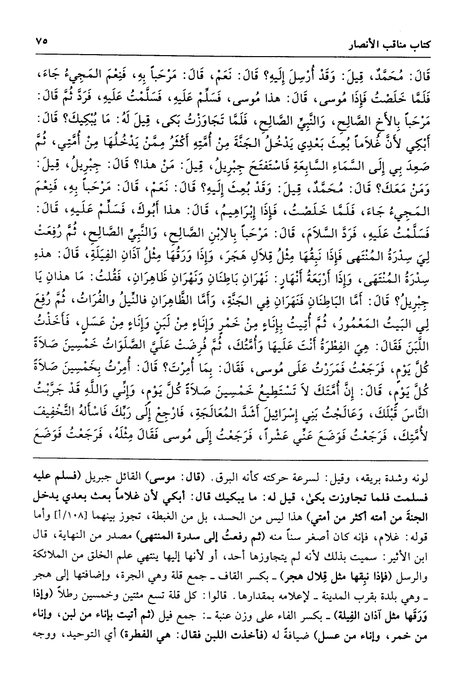 قَالَ مُحَمَّدٌ. قِيلَ وَقَدْ أُرْسِلَ إِلَيْهِ قَالَ نَعَمْ. قَالَ مَرْحَبًا بِهِ، فَنِعْمَ الْمَجِئُ جَاءَ، فَلَمَّا خَلَصْتُ، فَإِذَا مُوسَى قَالَ هَذَا مُوسَى فَسَلِّمْ عَلَيْهِ، فَسَلَّمْتُ عَلَيْهِ فَرَدَّ ثُمَّ قَالَ مَرْحَبًا بِالأَخِ الصَّالِحِ وَالنَّبِيِّ الصَّالِحِ. فَلَمَّا تَجَاوَزْتُ بَكَى، قِيلَ لَهُ مَا يُبْكِيكَ قَالَ أَبْكِى لأَنَّ غُلاَمًا بُعِثَ بَعْدِى، يَدْخُلُ الْجَنَّةَ مِنْ أُمَّتِهِ أَكْثَرُ مَنْ يَدْخُلُهَا مِنْ أُمَّتِى. ثُمَّ صَعِدَ بِى إِلَى السَّمَاءِ السَّابِعَةِ، فَاسْتَفْتَحَ جِبْرِيلُ، قِيلَ مَنْ هَذَا قَالَ جِبْرِيلُ. قِيلَ وَمَنْ مَعَكَ قَالَ مُحَمَّدٌ. قِيلَ وَقَدْ بُعِثَ إِلَيْهِ. قَالَ نَعَمْ. قَالَ مَرْحَبًا بِهِ، فَنِعْمَ الْمَجِئُ جَاءَ فَلَمَّا خَلَصْتُ، فَإِذَا إِبْرَاهِيمُ قَالَ هَذَا أَبُوكَ فَسَلِّمْ عَلَيْهِ. قَالَ فَسَلَّمْتُ عَلَيْهِ، فَرَدَّ السَّلاَمَ قَالَ مَرْحَبًا بِالاِبْنِ الصَّالِحِ وَالنَّبِيِّ الصَّالِحِ. ثُمَّ رُفِعَتْ لِى سِدْرَةُ الْمُنْتَهَى، فَإِذَا نَبِقُهَا مِثْلُ قِلاَلِ هَجَرَ، وَإِذَا وَرَقُهَا مِثْلُ آذَانِ الْفِيَلَةِ قَالَ هَذِهِ سِدْرَةُ الْمُنْتَهَى، وَإِذَا أَرْبَعَةُ أَنْهَارٍ نَهْرَانِ بَاطِنَانِ، وَنَهْرَانِ ظَاهِرَانِ. فَقُلْتُ مَا هَذَانِ يَا جِبْرِيلُ قَالَ أَمَّا الْبَاطِنَانِ، فَنَهَرَانِ فِي الْجَنَّةِ، وَأَمَّا الظَّاهِرَانِ فَالنِّيلُ وَالْفُرَاتُ. ثُمَّ رُفِعَ لِى الْبَيْتُ الْمَعْمُورُ، ثُمَّ أُتِيتُ بِإِنَاءٍ مِنْ خَمْرٍ، وَإِنَاءٍ مِنْ لَبَنٍ وَإِنَاءٍ مِنْ عَسَلٍ، فَأَخَذْتُ اللَّبَنَ، فَقَالَ هِىَ الْفِطْرَةُ أَنْتَ عَلَيْهَا وَأُمَّتُكَ. ثُمَّ فُرِضَتْ عَلَىَّ الصَّلَوَاتُ خَمْسِينَ صَلاَةً كُلَّ يَوْمٍ. فَرَجَعْتُ فَمَرَرْتُ عَلَى مُوسَى، فَقَالَ بِمَا أُمِرْتَ قَالَ أُمِرْتُ بِخَمْسِينَ صَلاَةً كُلَّ يَوْمٍ. قَالَ إِنَّ أُمَّتَكَ لاَ تَسْتَطِيعُ خَمْسِينَ صَلاَةً كُلَّ يَوْمٍ، وَإِنِّى وَاللَّهِ قَدْ جَرَّبْتُ النَّاسَ قَبْلَكَ، وَعَالَجْتُ بَنِى إِسْرَائِيلَ أَشَدَّ الْمُعَالَجَةِ، فَارْجِعْ إِلَى رَبِّكَ فَاسْأَلْهُ التَّخْفِيفَ لأُمَّتِكَ. فَرَجَعْتُ، فَوَضَعَ عَنِّى عَشْرًا، فَرَجَعْتُ إِلَى مُوسَى فَقَالَ مِثْلَهُ، فَرَجَعْتُ فَوَضَعَ