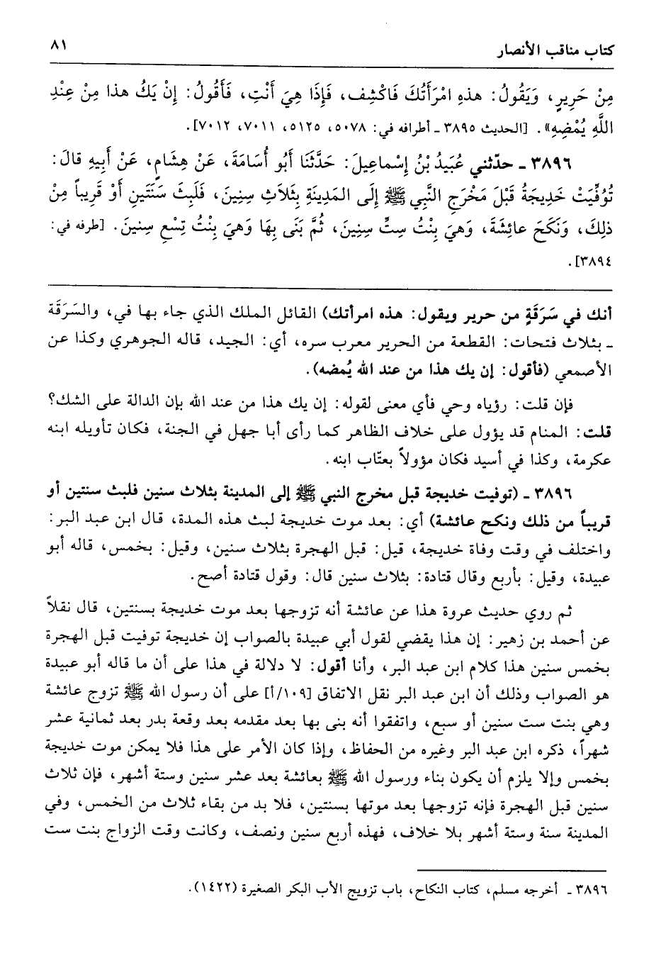 3896 - حَدَّثَنِى عُبَيْدُ بْنُ إِسْمَاعِيلَ حَدَّثَنَا أَبُو أُسَامَةَ عَنْ هِشَامٍ عَنْ أَبِيهِ قَالَ تُوُفِّيَتْ خَدِيجَةُ قَبْلَ مَخْرَجِ النَّبِيِّ - صلى الله عليه وسلم - إِلَى الْمَدِينَةِ بِثَلاَثِ سِنِينَ، فَلَبِثَ سَنَتَيْنِ أَوْ قَرِيبًا مِنْ ذَلِكَ، وَنَكَحَ عَائِشَةَ وَهْىَ بِنْتُ سِتِّ سِنِينَ، ثُمَّ بَنَى بِهَا وَهْىَ بِنْتُ تِسْعِ سِنِينَ. طرفه 3894