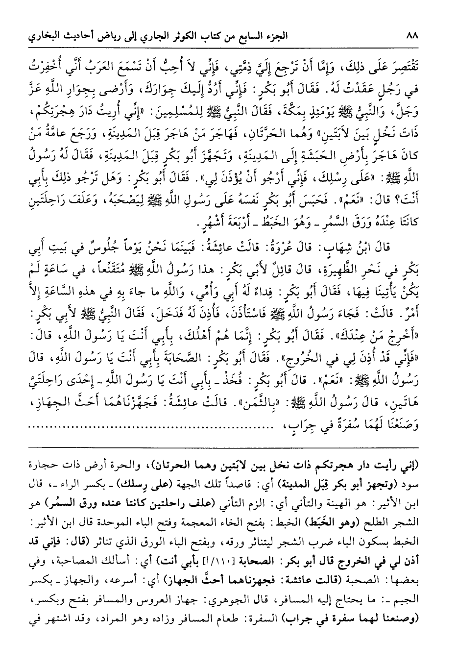 (إني رأيت دار هجرتكم ذات نخل بين لابَتين وهما الحرتان)، والحرة أرض ذات حجارة سود (وتجهز أبو بكر قِبَل المدينة) أي: قاصدًا تلك الجهة (على رِسلك) -بكسر الراء-، قال ابن الأثير: هو الهينة والتأني أي: الزم التأني (علف راحلتين كانتا عنده ورق السمُر) هو الشجر الطلح (وهو الخَبَط) الخبط: بفتح الخاء المعجمة وفتح الباء الموحدة قال ابن الأثير: الخبط بسكون الباء ضرب الشجر ليتناثر ورقه، وبفتح الباء الورق الذي تناثر (قال: فإني قد أذن لي في الخروج قال أبو بكر: الصحابة بأبي أنت) أي: أسألك المصاحبة، وفي بعضها: الصحبة (قالت عائشة: فجهزناهما أحثَّ الجهاز) أي: أسرعه، والجهاز -بكسر الجيم-: ما يحتاج إليه المسافر، قال الجوهري: جهاز العروس والمسافر بفتح وبكسر، (وصنعنا لهما سفرة في جراب) السفرة: طعام المسافر وزاده وهو المراد، وقد اشتهر في