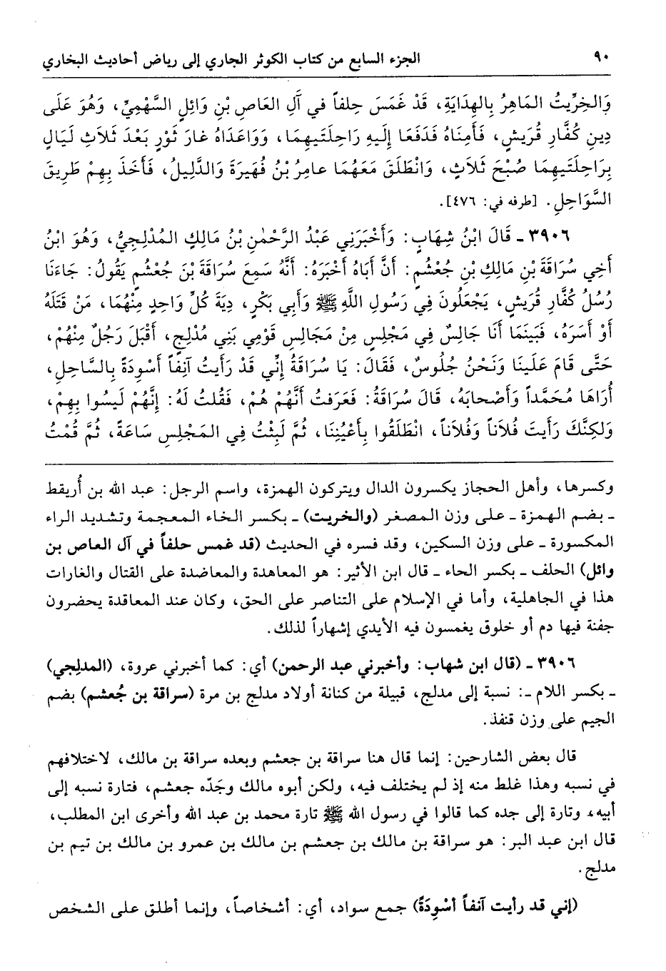 3906 - (قال ابن شهاب: وأخبرني عبد الرحمن) أي: كما أخبرني عروة، (المدلِجي) -بكسر اللام-: نسبة إلى مدلج، قبيلة من كنانة أولاد مدلج بن مرة (سراقة بن جُعشم) بضم الجيم على وزن قنفذ.