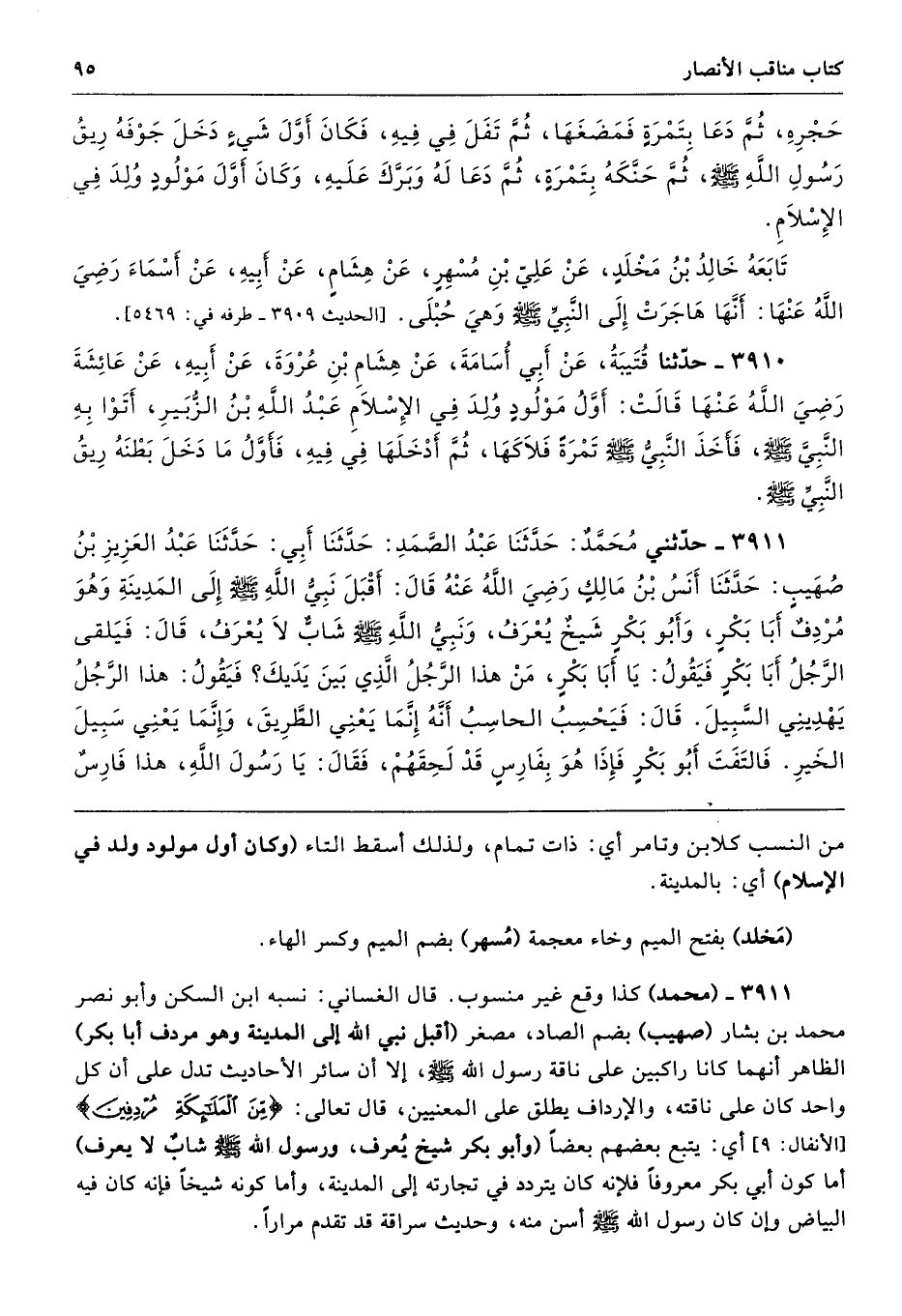 3911 - حَدَّثَنِى مُحَمَّدٌ حَدَّثَنَا عَبْدُ الصَّمَدِ حَدَّثَنَا أَبِى حَدَّثَنَا عَبْدُ الْعَزِيزِ بْنُ صُهَيْبٍ حَدَّثَنَا أَنَسُ بْنُ مَالِكٍ - رضى الله عنه - قَالَ أَقْبَلَ نَبِىُّ اللَّهِ - صلى الله عليه وسلم - إِلَى الْمَدِينَةِ وَهْوَ مُرْدِفٌ أَبَا بَكْرٍ، وَأَبُو بَكْرٍ شَيْخٌ يُعْرَفُ، وَنَبِىُّ اللَّهِ - صلى الله عليه وسلم - شَابٌّ لاَ يُعْرَفُ، قَالَ فَيَلْقَى الرَّجُلُ أَبَا بَكْرٍ فَيَقُولُ يَا أَبَا بَكْرٍ، مَنْ هَذَا الرَّجُلُ الَّذِى بَيْنَ يَدَيْكَ فَيَقُولُ هَذَا الرَّجُلُ يَهْدِينِى السَّبِيلَ. قَالَ فَيَحْسِبُ الْحَاسِبُ أَنَّهُ إِنَّمَا يَعْنِى الطَّرِيقَ، وَإِنَّمَا يَعْنِى سَبِيلَ الْخَيْرِ، فَالْتَفَتَ أَبُو بَكْرٍ، فَإِذَا هُوَ بِفَارِسٍ قَدْ لَحِقَهُمْ، فَقَالَ يَا رَسُولَ اللَّهِ، هَذَا فَارِسٌ