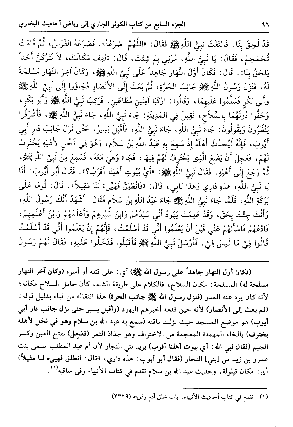 (فكان أول النهار جاهدًا على رسول الله - صلى الله عليه وسلم -) أي: على قتله أو أسره (وكان آخر النهار مسلحة له) المسلحة: مكان السلاح، فالكلام على طريقة الشبه، كأن حامل السلاح مكانه؛ لأنه كان يرد عنه العدو (فنزل رسول الله - صلى الله عليه وسلم - جانب الحرة) هذا انتقاله من قباء بدليل قوله: (ثم بعث إلى الأنصار) لأنه حين قدمه أخبرهم اليهود (وأقبل يسير حتى نزل جانب دار أبي أيوب) هو موضع المسجد حيث نزلت ناقته (سمع به عبد الله بن سلام وهو في نخل لأهله يخترف) بالخاء المهملة المعجمة من الاختراف وهو جذاذ الثمر (فعَجِل) بفتح العين وكسر الجيم (فقال نبي الله: أي بيوت أهلنا أقرب) يريد بني النجار لأن أم عبد المطلب سلمى بنت عمرو بن زيد من [بني] النجار (فقال أبو أيوب: هذه داري، فقال: انطلق فهيئ لنا مقيلًا) أي: مكان قيلولة، وحديث عبد الله بن سلام تقدم في كتاب الأنبياء وفي مناقبه.