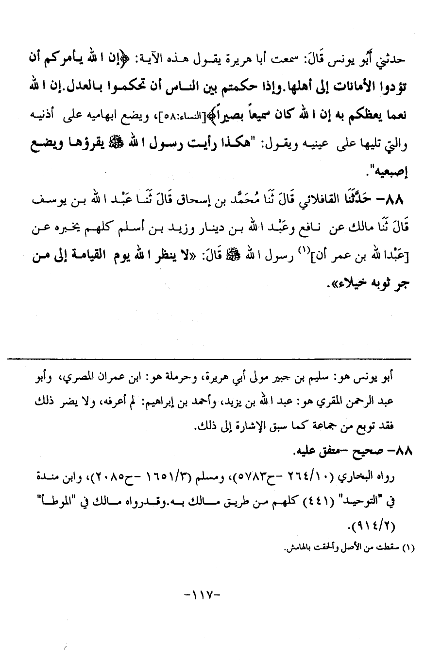 88 - حَدَّثَنَا الْقَافْلَائِي، قَالَ: ثنا مُحَمَّدُ بْنُ إِسْحَاقَ، قَالَ: ثنا عَبْدُ اللَّهِ بْنُ يُوسُفَ، قَالَ: ثنا مَالِكٌ، عَنْ نَافِعٍ، وَعَبْدُ اللَّهِ بْنُ دِينَارٍ، وَزَيْدُ بْنُ أَسْلَمَ، كُلُّهُمْ يُخْبِرُهُ عَنْ عَبْدِ اللَّهِ بْنِ عُمَرَ، أَنَّ رَسُولَ اللَّهِ صَلَّى اللَّهُ عَلَيْهِ وَسَلَّمَ قَالَ: § «لَا يَنْظُرُ اللَّهُ يَوْمَ الْقِيَامَةِ إِلَى مَنْ جَرَّ ثَوْبَهُ خُيَلَاءَ»