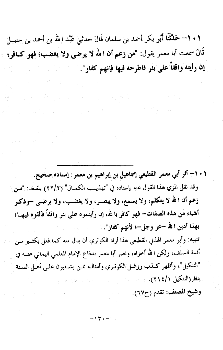 101 - حَدَّثَنَا أَبُو بَكْرٍ أَحْمَدُ بْنُ سَلْمَانَ، قَالَ: حَدَّثَنِي عَبْدُ اللَّهِ بْنُ أَحْمَدَ بْنِ حَنْبَلٍ، قَالَ: سَمِعْتُ أَبَا مَعْمَرٍ، يَقُولُ: §مَنْ زَعَمَ أَنَّ اللَّهَ لَا يَرْضَى وَلَا يَغْضَبُ، فَهُوَ كَافِرٌ، إِنْ رَأَيْتَهُ وَاقِفًا عَلَى بِئْرٍ فَاطْرَحْهُ فِيهَا فَإِنَّهُمْ كُفَّارٌ