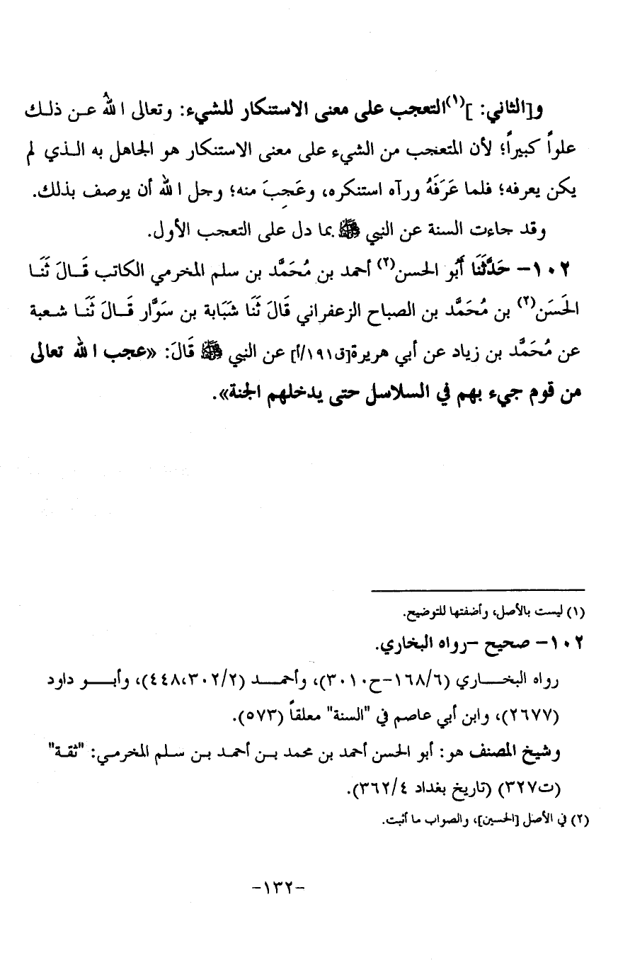 102 - حَدَّثَنَا أَبُو الْحَسَنِ أَحْمَدُ بْنُ مُحَمَّدِ بْنِ سَلْمٍ الْمُخَرِّمِيُّ الْكَاتِبُ قَالَ: ثنا الْحَسَنُ بْنُ مُحَمَّدِ بْنِ الصَّبَّاحِ الزَّعْفَرَانِيُّ، قَالَ: ثنا شَبَابَةُ بْنُ سِوَارٍ، قَالَ: ثنا شُعْبَةُ، عَنْ مُحَمَّدِ بْنِ زِيَادٍ، عَنْ أَبِي هُرَيْرَةَ، عَنِ النَّبِيِّ صَلَّى اللَّهُ عَلَيْهِ وَسَلَّمَ قَالَ: § «عَجِبَ اللَّهُ تَعَالَى مِنْ قَوْمٍ جِيءَ بِهِمْ فِي السَّلَاسِلِ حَتَّى يُدْخِلَهُمُ الْجَنَّةَ»