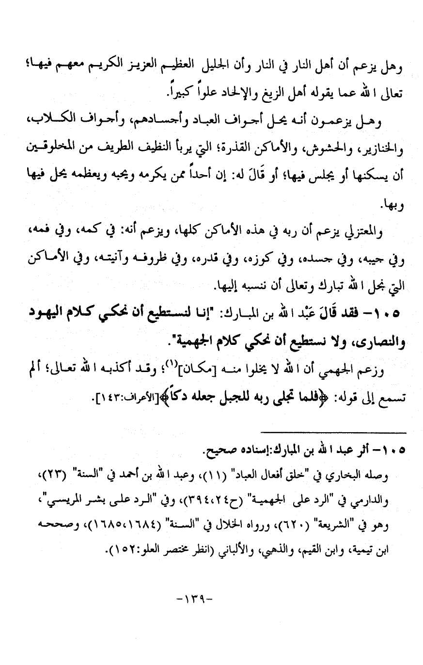 105 - فَقَدْ قَالَ عَبْدُ اللَّهِ بْنُ الْمُبَارَكِ: إِنَّا لَنَسْتَطِيعُ أَنْ نَحْكِيَ كَلَامَ الْيَهُودِ وَالنَّصَارَى، وَلَا نَسْتَطِيعُ أَنْ نَحْكِيَ كَلَامَ الْجَهْمِيَّةِ، وَزَعَمَ الْجَهْمِيُّ أَنَّ اللَّهَ لَا يَخْلُو مِنْهُ مَكَانٌ، وَقَدْ أَكْذَبَهُ اللَّهُ تَعَالَى، أَلَمْ تَسْمَعْ إِلَى قَوْلِهِ: {فَلَمَّا تَجَلَّى رَبُّهُ لِلْجَبَلِ جَعَلَهُ دَكًّا} [الأعراف: 143]؟