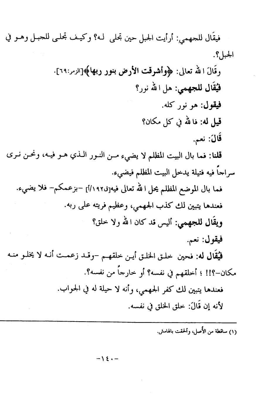 فَيُقَالُ لِلْجَهْمِيِّ: أَرَأَيْتَ الْجَبَلَ حِينَ تَجَلَّى لَهُ؟ وَكَيْفَ تَجَلَّى لِلْجَبَلِ وَهُوَ فِي الْجَبَلِ؟ وَقَالَ اللَّهُ تَعَالَى: {وَأَشْرَقَتِ الْأَرْضُ بِنُورِ رَبِّهَا} [الزمر: 69]، فَيُقَالُ لِلْجَهْمِيِّ: هَلِ اللَّهُ نُورٌ؟ فَيَقُولُ: هُوَ نُورٌ كُلُّهُ، قِيلَ لَهُ: فَاللَّهُ فِي كُلِّ مَكَانٍ؟ قَالَ: نَعَمْ، قُلْنَا: فَمَا بَالُ الْبَيْتِ الْمُظْلِمُ لَا يُضِيءُ مِنَ النُّورِ الَّذِي هُوَ فِيهِ، وَنَحْنُ نَرَى سِرَاجًا فِيهِ فَتِيلَةٌ يَدْخُلُ الْبَيْتَ الْمُظْلِمَ فَيُضِيءُ؟، فَمَا بَالُ الْمَوْضِعُ الْمُظْلِمُ يَحِلُّ اللَّهُ تَعَالَى فِيهِ بِزَعْمِكُمْ، فَلَا يُضِيءُ؟ فَعِنْدَهَا يَتَبَيَّنُ لَكَ كَذِبُ الْجَهْمِيِّ، وَعَظِيمُ فِرْيَتِهِ عَلَى رَبِّهِ، وَيُقَالُ لِلْجَهْمِيِّ: أَلَيْسَ قَدْ كَانَ اللَّهُ وَلَا خَلْقَ؟ فَيَقُولُ: نَعَمْ، فَيُقَالُ لَهُ: فَحِينَ خَلَقَ الْخَلْقَ أَيْنَ خَلَقَهُمْ وَقَدْ زَعَمْتَ أَنَّهُ لَا يَخْلُو مِنْهُ مَكَانٌ؟ أَخَلَقَهُمْ فِي نَفْسِهِ؟ أَوْ خَارِجًا مِنْ نَفْسِهِ؟ فَعِنْدَهَا يَتَبَيَّنُ لَكَ كُفْرُ الْجَهْمِيِّ، وَأَنَّهُ لَا حِيلَةَ لَهُ فِي الْجَوَابِ؛ لِأَنَّهُ إِنْ قَالَ: خَلَقَ الْخَلْقَ فِي نَفْسِهِ،