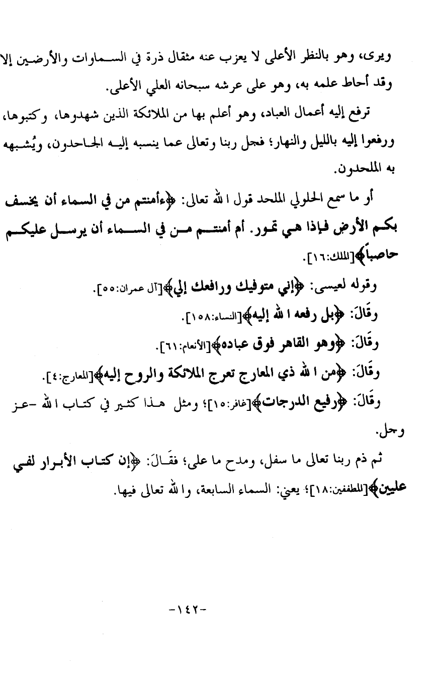 وَيَرَى، وَهُوَ بِالنَّظَرِ الْأَعْلَى لَا يَعْزُبُ عَنْهُ مِثْقَالُ ذَرَّةٍ فِي السَّمَاوَاتِ وَالْأَرَضِينَ إِلَّا وَقَدْ أَحَاطَ عِلْمُهُ بِهِ، وَهُوَ عَلَى عَرْشِهِ سُبْحَانَهُ الْعَلِيُّ الْأَعْلَى تُرْفَعُ إِلَيْهِ أَعْمَالُ الْعِبَادِ، وَهُوَ أَعْلَمُ بِهَا مِنَ الْمَلَائِكَةِ الَّذِينَ شَهِدُوهَا وَكَتَبُوهَا، وَرَفَعُوا إِلَيْهِ بِاللَّيْلِ وَالنَّهَارِ، فَجَلَّ رَبُّنَا وَتَعَالَى عَمَّا يَنْسُبُهُ إِلَيْهِ الْجَاحِدُونَ، وَيُشَبِّهُهُ بِهِ الْمُلْحِدُونَ، أَوَمَا سَمِعَ الْحُلُولِيُّ الْمُلْحِدُ قَوْلَ اللَّهِ تَعَالَى: {أَأَمِنْتُمْ مَنْ فِي السَّمَاءِ أَنْ يَخْسِفَ بِكُمُ الْأَرْضَ فَإِذَا هِيَ تَمُورُ، أَمْ أَمِنْتُمْ مَنْ فِي السَّمَاءِ أَنْ يُرْسِلَ عَلَيْكُمْ حَاصِبًا} [الملك: 16]، وَقَوْلَهُ لِعِيسَى: {إِنِّي مُتَوَفِّيكَ وَرَافِعُكَ إِلَيَّ} [آل عمران: 55] وَقَالَ: {بَلْ رَفَعَهُ اللَّهُ إِلَيْهِ} [النساء: 158]، وَقَالَ: {وَهُوَ الْقَاهِرُ فَوْقَ عِبَادِهِ} [الأنعام: 18]، وَقَالَ: {مِنَ اللَّهِ ذِي الْمَعَارِجِ تَعْرُجُ الْمَلَائِكَةُ وَالرُّوحُ إِلَيْهِ} [المعارج: 3]، وَقَالَ: {رَفِيعُ الدَّرَجَاتِ} [غافر: 15]، وَمِثْلُ هَذَا كَثِيرٌ فِي كِتَابِ اللَّهِ عَزَّ وَجَلَّ، ثُمَّ ذَمَّ رَبُّنَا تَعَالَى مَا سَفَلَ، وَمَدَحَ مَا عَلَا، فَقَالَ: {إِنَّ كِتَابَ الْأَبْرَارِ لَفِي عِلِّيِّينَ} [المطففين: 18] يَعْنِي السَّمَاءَ السَّابِعَةَ وَاللَّهُ تَعَالَى فِيهَا،