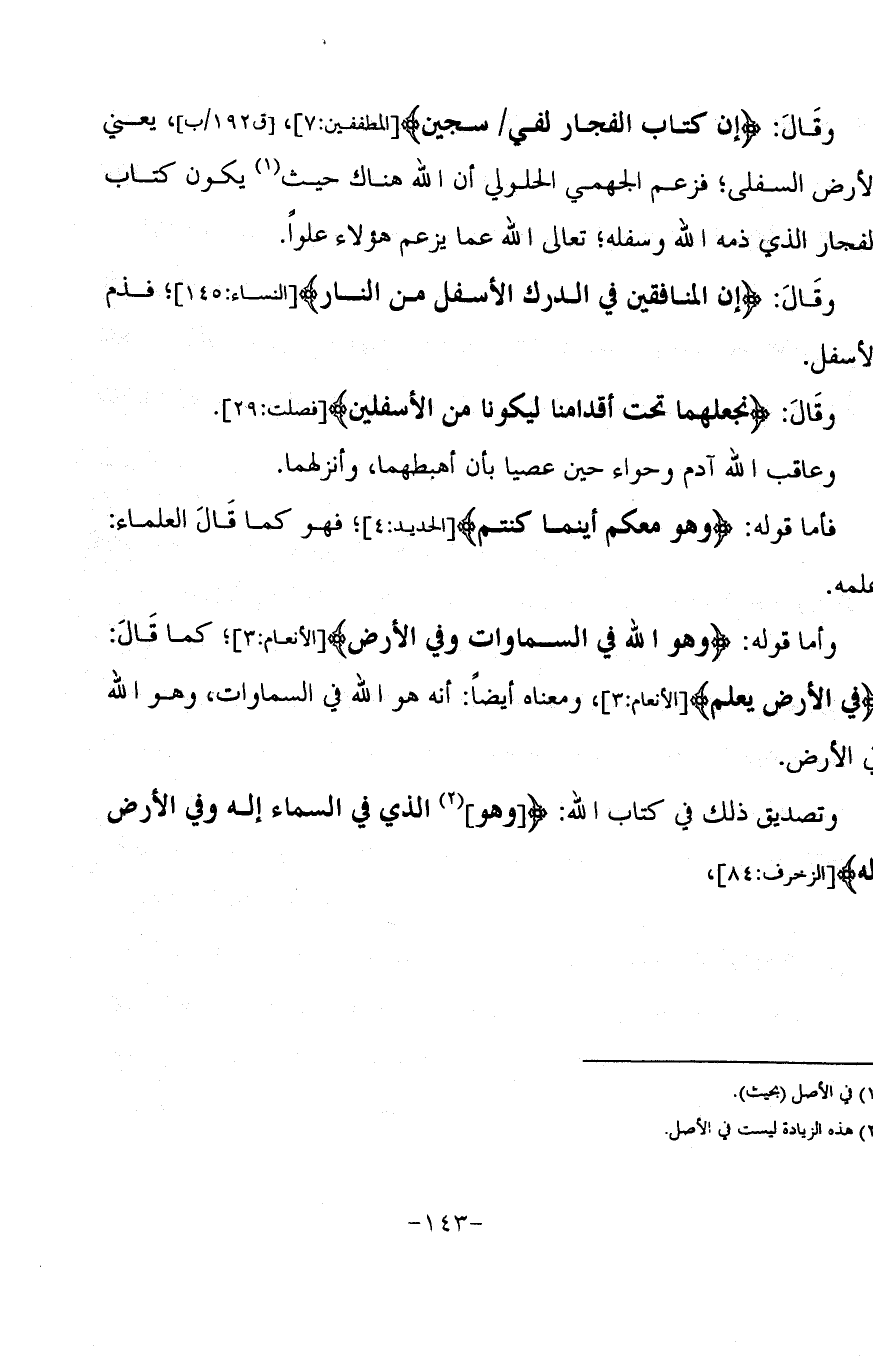 وَقَالَ: {إِنَّ كِتَابَ الْفُجَّارِ لَفِي سِجِّينَ} [المطففين: 7]، يَعْنِي الْأَرْضَ السُّفْلَى، فَزَعَمَ الْجَهْمِيُّ الْحُلُولِيُّ أَنَّ اللَّهَ هُنَاكَ حَيْثُ يَكُونُ كِتَابُ الْفُجَّارِ الَّذِي ذَمَّهُ اللَّهُ وَسَفَّلَهُ، تَعَالَى اللَّهُ عَمَّا يَزْعُمُ هَؤُلَاءِ عُلُوًّا، وَقَالَ: {إِنَّ الْمُنَافِقِينَ فِي الدَّرْكِ الْأَسْفَلِ مِنَ النَّارِ} [النساء: 145]، فَذَمَّ الْأَسْفَلَ، وَقَالَ: {نَجَعَلْهُمَا تَحْتَ أَقْدَامِنَا لِيَكُونَا مِنَ الْأَسْفَلِينَ} [فصلت: 29]، وَعَاقَبَ اللَّهُ آدَمَ وَحَوَّاءَ حِينَ عَصَيَا بِأَنْ أَهْبَطَهُمَا وَأَنْزَلَهُمَا، فَأَمَّا قَوْلُهُ: {وَهُوَ مَعَكُمْ أَيْنَمَا كُنْتُمْ}، فَهُوَ كَمَا قَالَ الْعُلَمَاءُ: عِلْمُهُ، وَأَمَّا قَوْلُهُ: {وَهُوَ اللَّهُ فِي السَّمَوَاتِ وَفِي الْأَرْضِ}، كَمَا قَالَ: {فِي الْأَرْضِ يَعْلَمُ} [الأنعام: 3]، وَمَعْنَاهُ أَيْضًا: أَنَّهُ هُوَ اللَّهُ فِي السَّمَاوَاتِ، وَهُوَ اللَّهُ فِي الْأَرْضِ، وَتَصْدِيقُ ذَلِكَ فِي كِتَابِ اللَّهِ: {وَهُوَ الَّذِي فِي السَّمَاءِ إِلَهٌ وَفِي الْأَرْضِ إِلَهٌ} [الزخرف: 84]،