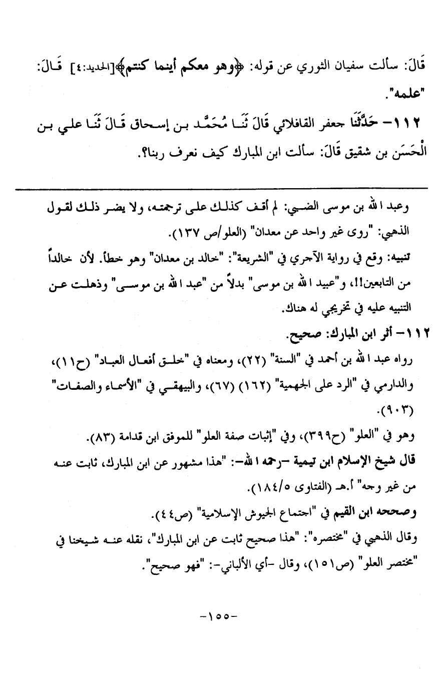 112 - حَدَّثَنَا جَعْفَرٌ الْقَافْلَائِي، قَالَ: ثنا مُحَمَّدُ بْنُ إِسْحَاقَ، قَالَ: ثنا عَلِيُّ بْنُ الْحَسَنِ بْنِ شَقِيقٍ، قَالَ: سَأَلْتُ ابْنَ الْمُبَارَكِ كَيْفَ نَعْرِفُ رَبَّنَا؟ -[156]- قَالَ: §عَلَى السَّمَاءِ السَّابِعَةِ عَلَى عَرْشِهِ، لَا نَقُولُ كَمَا تَقُولُ الْجَهْمِيَّةُ: إِنَّ إِلَهَنَا فِي الْأَرْضِ