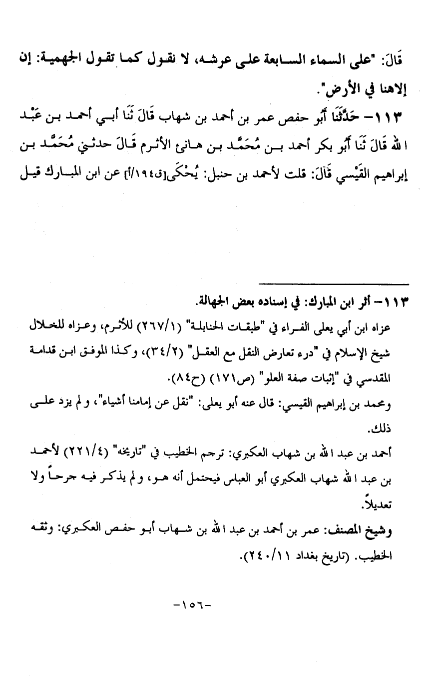113 - حَدَّثَنَا أَبُو حَفْصٍ عُمَرُ بْنُ أَحْمَدَ بْنِ شِهَابٍ قَالَ: ثنا أَبِي أَحْمَدُ بْنُ عَبْدِ اللَّهِ، قَالَ: ثنا أَبُو بَكْرِ أَحْمَدُ بْنُ مُحَمَّدِ بْنِ هَانِئٍ الْأَثْرَمُ، قَالَ: حَدَّثَنِي مُحَمَّدُ بْنُ إِبْرَاهِيمَ الْقَيْسِيُّ، قَالَ: قُلْتُ لِأَحْمَدَ بْنِ حَنْبَلٍ: يُحْكَى عَنِ ابْنِ الْمُبَارَكِ، قِيلَ -[157]- لَهُ: كَيْفَ نَعْرِفُ رَبَّنَا تَعَالَى؟، قَالَ: §فِي السَّمَاءِ السَّابِعَةِ عَلَى عَرْشِهِ بِحَدٍّ، قَالَ أَحْمَدُ: هَكَذَا هُوَ عِنْدَنَا