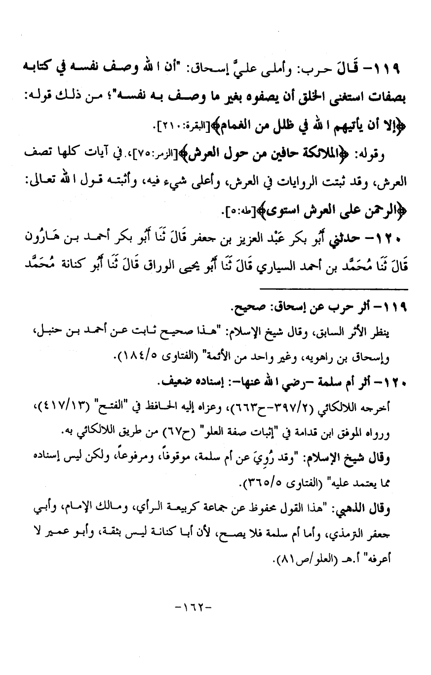 120 - حَدَّثَنِي أَبُو بَكْرٍ عَبْدُ الْعَزِيزِ بْنُ جَعْفَرٍ قَالَ: ثنا أَبُو بَكْرٍ أَحْمَدُ بْنُ هَارُونَ قَالَ: ثنا مُحَمَّدُ بْنُ أَحْمَدَ السَّيَّارِيُّ، قَالَ: ثنا أَبُو يَحْيَى الْوَرَّاقُ، قَالَ: ثنا أَبُو كِنَانَةَ مُحَمَّد -[163]- بْنُ الْأَشْرَسِ قَالَ: ثنا عُمَيْرُ بْنُ عَبْدِ الْحَمِيدِ الثَّقَفِيُّ، قَالَ: ثنا قُرَّةُ بْنُ خَالِدٍ، عَنِ الْحَسَنِ، عَنْ أُمِّهِ، عَنْ أُمِّ سَلَمَةَ فِي قَوْلِهِ: {§الرَّحْمَنُ عَلَى الْعَرْشِ اسْتَوَى} [طه: 5]، قَالَتِ: الْكَيْفُ غَيْرُ مَعْقُولٍ وَالِاسْتِوَاءُ غَيْرُ مَجْهُولٍ، وَالْإِقْرَارُ بِهِ إِيمَانٌ، وَالْجُحُوُدُ بِهِ كُفْرٌ