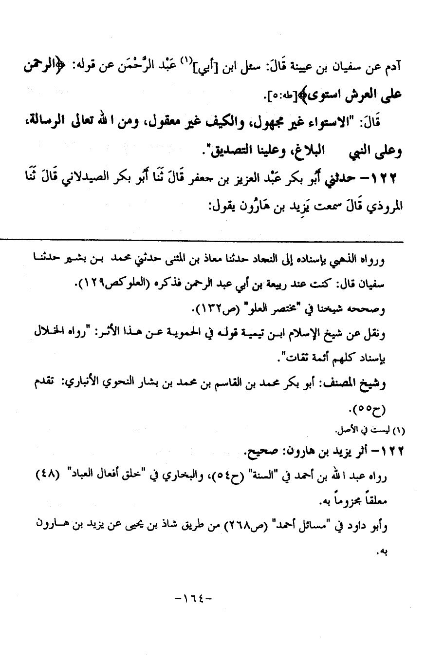 122 - حَدَّثَنِي أَبُو بَكْرِ عَبْدُ الْعَزِيزِ بْنُ جَعْفَرٍ، قَالَ: ثنا أَبُو بَكْرٍ الصَّيْدَلَانِيُّ، قَالَ: ثنا الْمَرُّوذِيُّ، قَالَ سَمِعْتُ يَزِيدَ بْنَ هَارُونَ، يَقُولُ: -[165]- §مَنْ زَعَمَ أَنَّ {الرَّحْمَنَ عَلَى الْعَرْشِ اسْتَوَى} [طه: 5] عَلَى خِلَافِ مَا يُقَرُّ فِي قُلُوبِ الْعَامَّةِ فَهُوَ جَهْمِيٌّ