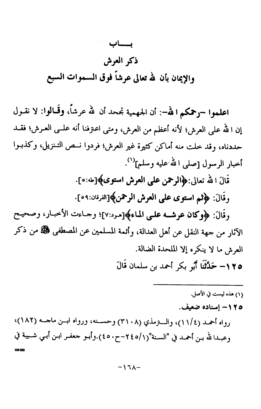 §بَابُ ذِكْرِ الْعَرْشِ وَالْإِيمَانِ بِأَنَّ لِلَّهِ تَعَالَى عَرْشًا فَوْقَ السَّمَوَاتِ السَّبْعِ اعْلَمُوا رَحِمَكُمُ اللَّهُ أَنَّ الْجَهْمِيَّةَ تَجْحَدُ أَنَّ لِلَّهَ عَرْشًا، وَقَالُوا: لَا نَقُولُ: إِنَّ اللَّهَ عَلَى الْعَرْشِ؛ لِأَنَّهُ أَعْظَمُ مِنَ الْعَرْشِ، وَمَتَى اعْتَرَفْنَا أَنَّهُ عَلَى الْعَرْشِ، فَقَدْ حَدَّدْنَاهُ، وَقَدْ خَلَتْ مِنْهُ أَمَاكِنُ كَثِيرَةٌ غَيْرُ الْعَرْشِ، فَرَدُّوا نَصَّ التَّنْزِيلِ، وَكَذَّبُوا أَخْبَارَ الرَّسُولِ صَلَّى اللَّهُ عَلَيْهِ وَسَلَّمَ، قَالَ اللَّهُ تَعَالَى: {الرَّحْمَنُ عَلَى الْعَرْشِ اسْتَوَى} [طه: 5]، وَقَالَ: {ثُمَّ اسْتَوَى عَلَى الْعَرْشِ الرَّحْمَنُ} [الفرقان: 59]، وَقَالَ: {وَكَانَ عَرْشُهُ عَلَى الْمَاءِ} [هود: 7]، وَجَاءَتِ الْأَخْبَارُ وَصَحِيحُ الْآثَارِ مِنْ جِهَةِ النَّقْلِ عَنْ أَهْلِ الْعَدَالَةِ وَأَئِمَّةِ الْمُسْلِمِينَ عَنِ الْمُصْطَفَى صَلَّى اللَّهُ عَلَيْهِ وَسَلَّمَ مِنْ ذِكْرِ الْعَرْشِ مَا لَا يُنْكِرْهُ إِلَّا الْمُلْحِدَةُ الضَّالَّةُ