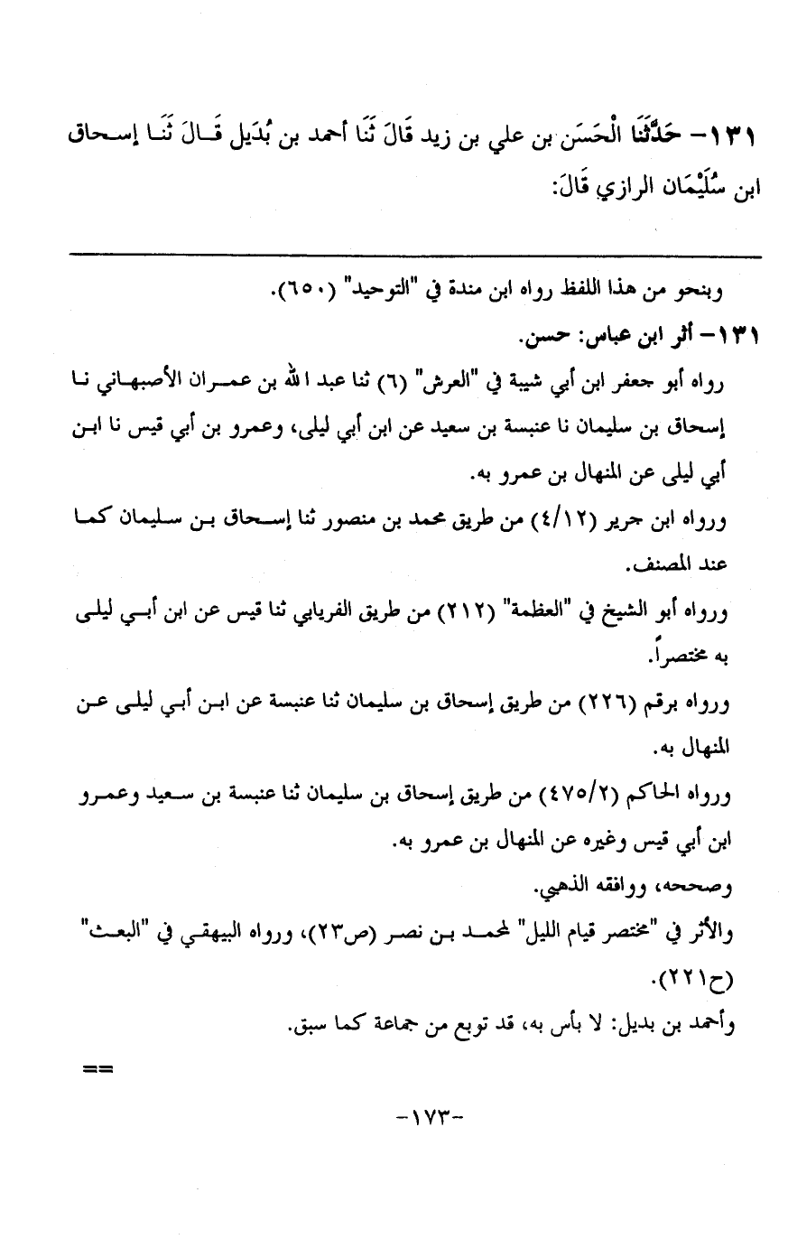 131 - حَدَّثَنَا الْحَسَنُ بْنُ عَلِيِّ بْنِ زَيْدٍ، قَالَ: ثنا أَحْمَدُ بْنُ بُدَيْلٍ، قَالَ: ثنا إِسْحَاقُ بْنُ سُلَيْمَانَ الرَّازِيُّ، قَالَ: -[174]- ثنا عَمْرُو بْنُ أَبِي قَيْسٍ، عَنِ ابْنِ أَبِي لَيْلَى، عَنِ الْمِنْهَالِ بْنِ عَمْرٍو، عَنْ سَعِيدِ بْنِ جُبَيْرٍ، عَنِ ابْنِ عَبَّاسٍ، فِي قَوْلِهِ تَعَالَى: {§وَكَانَ عَرْشُهُ عَلَى الْمَاءِ} [هود: 7]، قَالَ: " كَانَ عَرْشُ اللَّهِ عَلَى الْمَاءِ ثُمَّ اتَّخَذَ لِنَفْسِهِ جَنَّةً، ثُمَّ اتَّخَذَ دُونَهَا أُخْرَى، ثُمَّ أَطْبَقَهَا بِلُؤْلُؤَةٍ وَاحِدَةٍ، ثُمَّ قَرَأَ: {وَمِنْ دُونِهِمَا جَنَّتَانِ} [الرحمن: 62]، وَهِيَ الَّتِي قَالَ اللَّهُ تَعَالَى: {فَلَا تَعْلَمُ نَفْسٌ مَا أُخْفِيَ لَهُمْ مِنْ قُرَّةِ أَعْيُنٍ جَزَاءً بِمَا كَانُوا يَعْمَلُونَ} [السجدة: 17]، وَهِيَ الَّتِي لَا يَعْلَمُ الْخَلَائِقُ مَا فِيهَا، يَأْتِيهِمْ كُلَّ يَوْمِ مِنْهَا تُحْفَةٌ