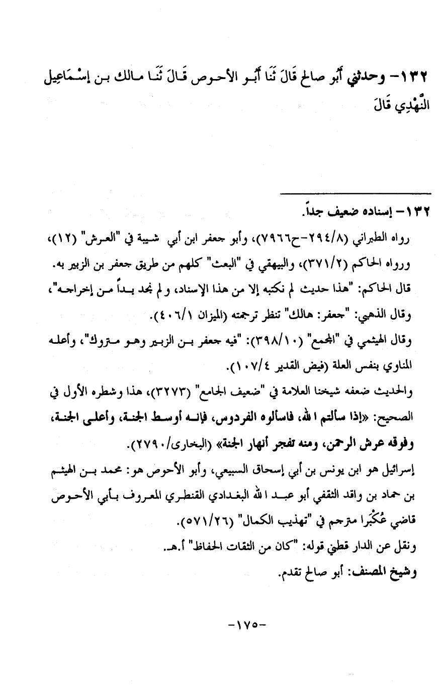 132 - وَحَدَّثَنِي أَبُو صَالِحٍ، قَالَ: ثنا أَبُو الْأَحْوَصِ، قَالَ: ثنا مَالِكُ بْنُ إِسْمَاعِيلَ النَّهْدِيُّ، قَالَ: -[176]- ثنا إِسْرَائِيلُ، عَنْ جَعْفَرِ بْنِ الزُّبَيْرِ، عَنِ الْقَاسِمِ، عَنْ أَبِي أُمَامَةَ، قَالَ: قَالَ رَسُولُ اللَّهِ صَلَّى اللَّهُ عَلَيْهِ وَسَلَّمَ: «§سَلُوا اللَّهَ عَزَّ وَجَلَّ الْفِرْدَوْسَ؛ فَإِنَّهَا سُرَّةُ الْجَنَّةِ، وَإِنَّ أَهْلَ الْفِرْدَوْسِ يَسْمَعُونَ أَطِيطَ الْعَرْشِ»