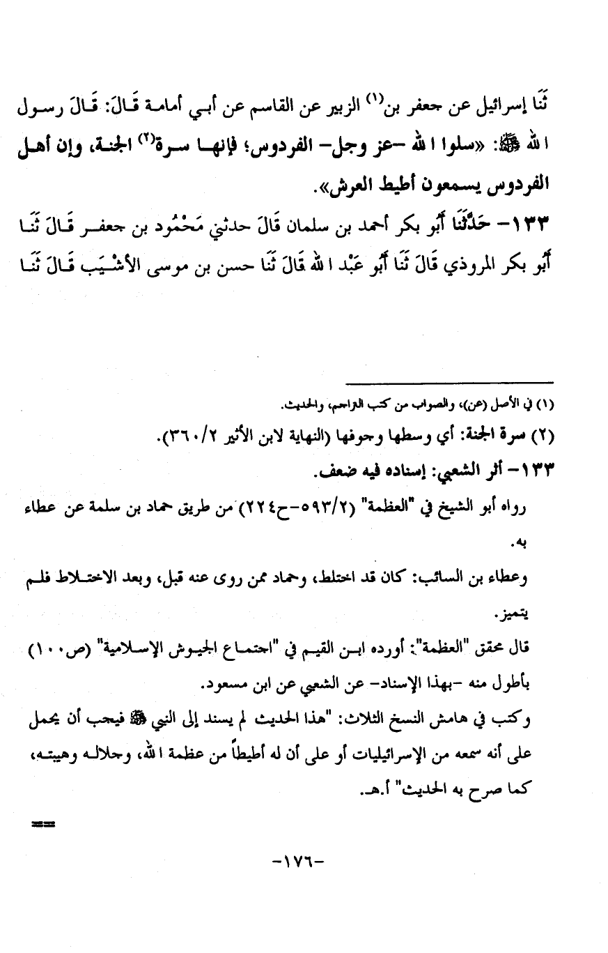 133 - حَدَّثَنَا أَبُو بَكْرٍ أَحْمَدُ بْنُ سَلْمَانَ قَالَ: حَدَّثَنِي مَحْمُودُ بْنُ جَعْفَرٍ، قَالَ: ثنا أَبُو بَكْرٍ الْمَرُّوذِيُّ، قَالَ ثنا أَبُو عَبْدِ اللَّهِ قَالَ: ثنا حَسَنُ بْنُ مُوسَى الْأَشْيَبُ، قَالَ: ثنا -[177]- حَمَّادٌ، عَنْ عَطَاءِ بْنِ السَّائِبِ، عَنِ الشَّعْبِيِّ، قَالَ: إِنَّ §اللَّهَ تَعَالَى قَدْ مَلَأَ الْعَرْشَ حَتَّى إِنَّ لَهُ أَطِيطًا كَأَطِيطِ الرَّحْلِ الْجَدِيدِ