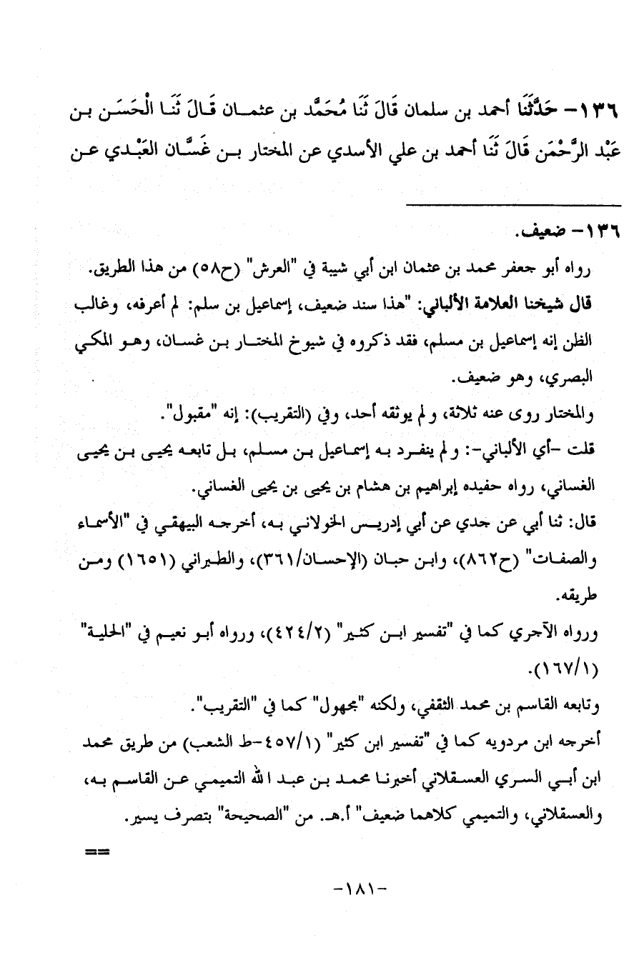 136 - حَدَّثَنَا أَحْمَدُ بْنُ سَلْمَانَ، قَالَ: ثنا مُحَمَّدُ بْنُ عُثْمَانَ، قَالَ: ثنا الْحَسَنُ بْنُ عَبْدِ الرَّحْمَنِ، قَالَ: ثنا أَحْمَدُ بْنُ عَلِيٍّ الْأَسَدِيُّ، عَنِ الْمُخْتَارِ بْنِ غَسَّانَ الْعَبْدِيِّ، عَنْ -[184]- إِسْمَاعِيلَ بْنِ مُسْلِمٍ، عَنْ أَبِي إِدْرِيسَ الْخَوْلَانِيِّ، عَنْ أَبِي ذَرٍّ الْغِفَارِيِّ، قَالَ: دَخَلْتُ الْمَسْجِدَ الْحَرَامَ، فَرَأَيْتُ رَسُولَ اللَّهِ صَلَّى اللَّهُ عَلَيْهِ وَسَلَّمَ وَحْدَهُ فَجَلَسْتُ إِلَيْهِ، فَقُلْتُ: يَا رَسُولَ اللَّهِ §أَيُّ آيَةٍ نَزَلَتْ عَلَيْكَ أَفْضَلُ؟ قَالَ: «آيَةُ الْكُرْسِيُّ، مَا السَّمَاوَاتُ السَّبْعُ فِي الْكُرْسِيِّ إِلَّا كَحَلْقَةٍ فِي أَرْضٍ فَلَاةٍ، وَفَضْلُ الْعَرْشِ عَلَى الْكُرْسِيِّ كَفَضْلِ تِلْكَ الْفَلَاةِ عَلَى تِلْكَ الْحَلْقَةِ»