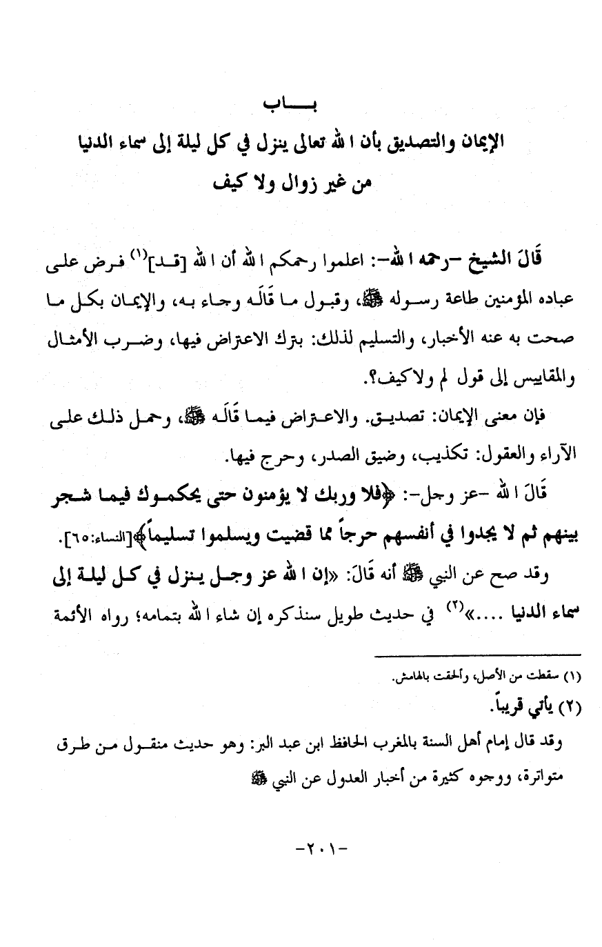 §بَابُ الْإِيمَانِ وَالتَّصْدِيقِ بِأَنَّ اللَّهَ تَعَالَى يَنْزِلُ فِي كُلِّ لَيْلَةٍ إِلَى سَمَاءِ الدُّنْيَا مِنْ غَيْرِ زَوَالٍ وَلَا كَيْفٍ قَالَ الشَّيْخُ رَحِمَهُ اللَّهُ: اعْلَمُوا رَحِمَكُمُ اللَّهُ أَنَّ اللَّهَ قَدْ فَرَضَ عَلَى عِبَادِهِ الْمُؤْمِنِينَ طَاعَةَ رَسُولِهِ صَلَّى اللَّهُ عَلَيْهِ وَسَلَّمَ، وَقَبُولَ مَا قَالَهُ وَجَاءَ بِهِ، وَالْإِيمَانَ بِكُلِّ مَا صَحَّتْ بِهِ عَنْهُ الْأَخْبَارُ، وَالتَّسْلِيمَ لِذَلِكَ بِتَرْكِ الِاعْتِرَاضِ فِيهَا وَضَرْبِ الْأَمْثَالِ وَالْمَقَايِيسِ إِلَى قَوْلِ: لِمَ , وَلَا كَيْفَ؟ فَإِنَّ مَعْنَى الْإِيمَانِ: تَصْدِيقٌ، وَالِاعْتِرَاضُ فِيمَا قَالَهُ صَلَّى اللَّهُ عَلَيْهِ وَسَلَّمَ وَحَمْلُ ذَلِكَ عَلَى الْآرَاءِ وَالْعُقُولِ تَكْذِيبٌ، وَضِيقُ الصَّدْرِ، وَحَرَجٌ فِيهَا، قَالَ اللَّهُ عَزَّ وَجَلَّ: {فَلَا وَرَبِّكَ لَا يُؤْمِنُونَ حَتَّى يُحَكِّمُوكَ فِيمَا شَجَرَ بَيْنَهُمْ ثُمَّ لَا يَجِدُوا فِي أَنْفُسِهِمْ حَرَجًا مِمَّا قَضَيْتَ وَيُسَلِّمُوا تَسْلِيمًا} [النساء: 65]، وَقَدْ صَحَّ عَنِ النَّبِيِّ صَلَّى اللَّهُ عَلَيْهِ وَسَلَّمَ أَنَّهُ قَالَ: «إِنَّ اللَّهَ عَزَّ وَجَلَّ يَنْزِلُ فِي كُلِّ لَيْلَةٍ إِلَى سَمَاءِ الدُّنْيَا. . .» فِي حَدِيثٍ طَوِيلٍ سَنَذْكُرُهُ إِنْ شَاءَ اللَّهُ بِتَمَامِهِ، رَوَاهُ الْأَئِمَّةُ
