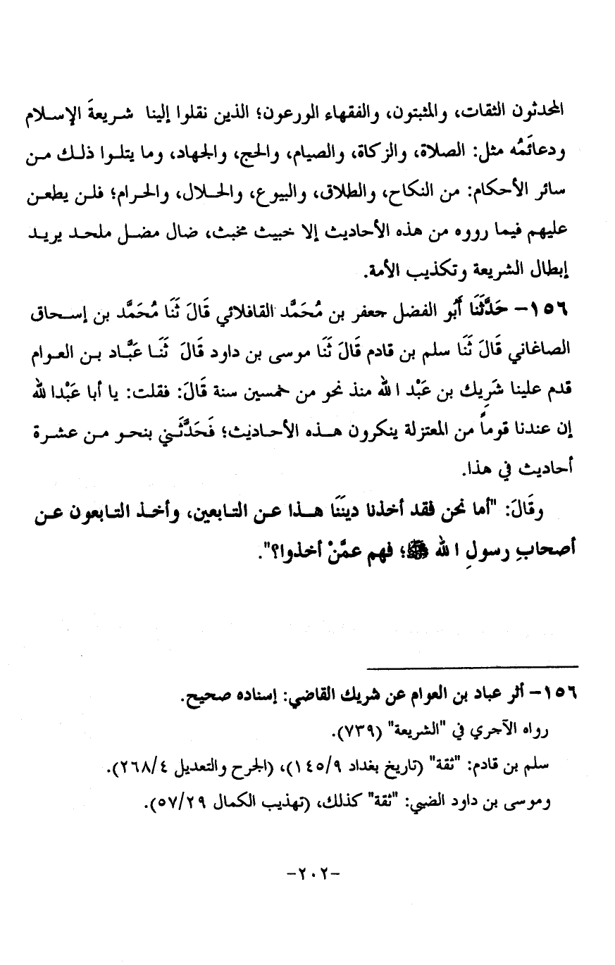 156 - حَدَّثَنَا أَبُو الْفَضْلِ جَعْفَرُ بْنُ مُحَمَّدٍ الْقَافْلَائِيُّ قَالَ: ثنا مُحَمَّدُ بْنُ إِسْحَاقَ الصَّاغَانِيُّ، قَالَ: ثنا سَلْمُ بْنُ قَادِمٍ، قَالَ: ثنا مُوسَى بْنُ دَاوُدَ، قَالَ: ثنا عَبَّادُ بْنُ الْعَوَّامِ، قَدِمَ عَلَيْنَا شَرِيكُ بْنُ عَبْدِ اللَّهِ مُنْذُ نَحْوٍ مِنْ خَمْسِينَ سَنَةً قَالَ: فَقُلْتُ: يَا أَبَا عَبْدِ اللَّهِ إِنَّ عِنْدَنَا قَوْمًا مِنَ §الْمُعْتَزِلَةِ يُنْكِرُونَ هَذِهِ الْأَحَادِيثَ، فَحَدَّثَنِي بِنَحْوٍ مِنْ عَشَرَةِ أَحَادِيثَ فِي هَذَا , وَقَالَ: أَمَّا نَحْنُ فَقَدْ أَخَذْنَا دِينَنَا هَذَا عَنِ التَّابِعِينَ، وَأَخَذَ التَّابِعُونَ عَنْ أَصْحَابِ رَسُولِ اللَّهِ صَلَّى اللَّهُ عَلَيْهِ وَسَلَّمَ، فَهُمْ عَمَّنْ أَخَذُوا؟