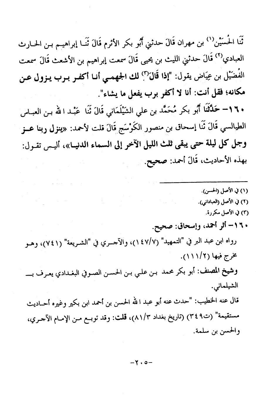 160 - حَدَّثَنَا أَبُو بَكْرٍ مُحَمَّدُ بْنُ عَلِيٍّ الشَّيْلَمَانِيُّ قَالَ: ثنا عَبْدُ اللَّهِ بْنُ الْعَبَّاسِ الطَّيَالِسِيُّ، قَالَ: ثنا إِسْحَاقُ بْنُ مَنْصُورٍ الْكَوْسَجُ، قَالَ: قُلْتُ لِأَحْمَدَ: § «يَنْزِلُ رَبُّنَا عَزَّ وَجَلَّ كُلَّ لَيْلَةٍ حَتَّى يَبْقَى ثُلُثُ اللَّيْلِ الْآخَرُ إِلَى السَّمَاءِ الدُّنْيَا» أَلَيْسَ تَقُولُ بِهَذِهِ الْأَحَادِيثِ؟ قَالَ أَحْمَدُ: صَحِيحٌ. -[206]- قَالَ إِسْحَاقُ بْنُ رَاهَوَيْهِ: وَلَا يَدَعُهُ إِلَّا مُبْتَدِعٌ أَوْ ضَعِيفُ الرَّأْيِ