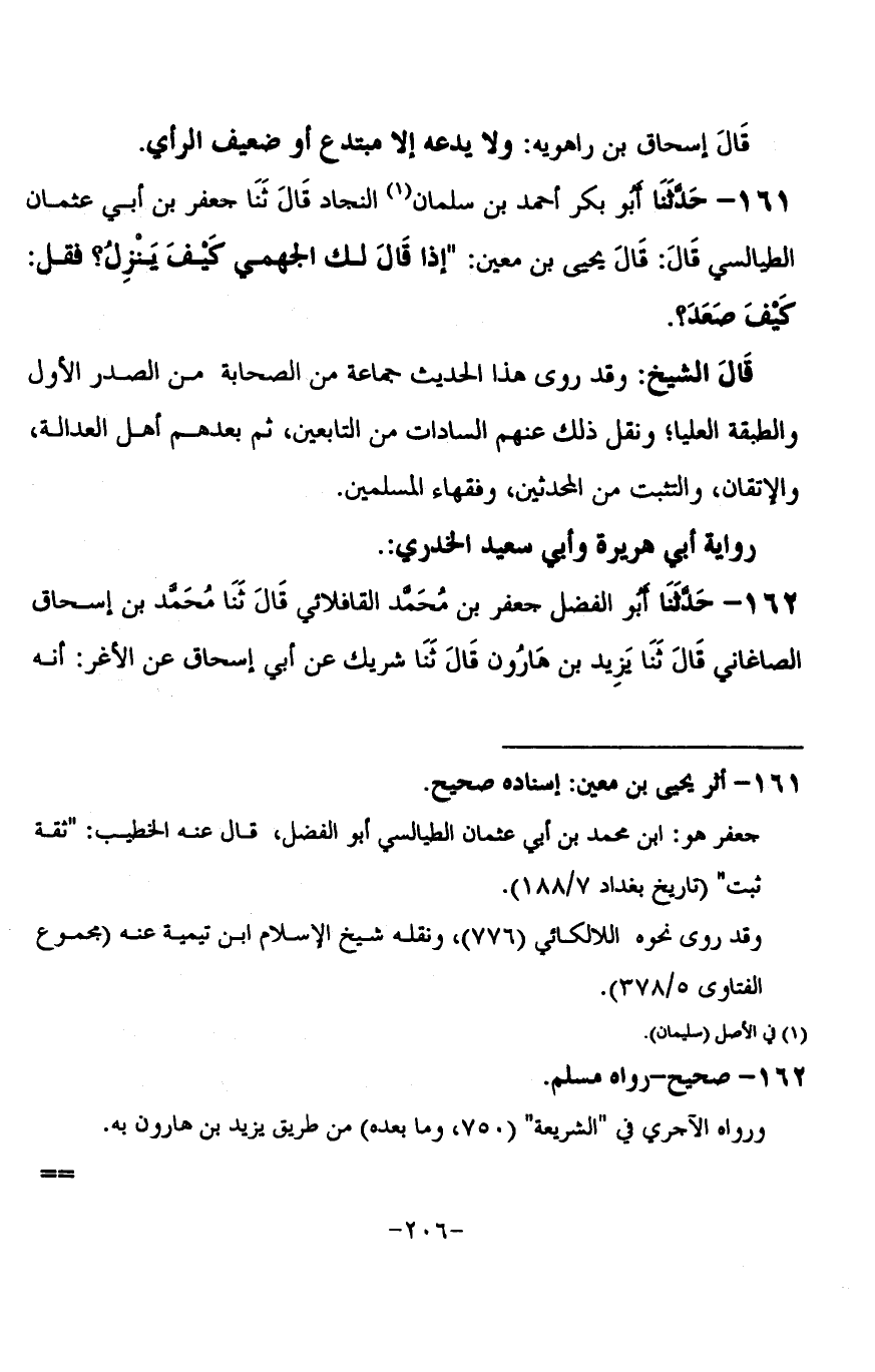 161 - حَدَّثَنَا أَبُو بَكْرٍ أَحْمَدُ بْنُ سَلْمَانَ النَّجَّادُ قَالَ: ثنا جَعْفَرُ بْنُ أَبِي عُثْمَانَ الطَّيَالِسِيُّ، قَالَ: قَالَ يَحْيَى بْنُ مَعِينٍ: §إِذَا قَالَ لَكَ الْجَهْمِيُّ: كَيْفَ يَنْزِلُ؟ فَقُلْ: كَيْفَ صَعِدَ؟ قَالَ الشَّيْخُ: وَقَدْ رَوَى هَذَا الْحَدِيثَ جَمَاعَةٌ مِنَ الصَّحَابَةِ مِنَ الصَّدْرِ الْأَوَّلِ وَالطَّبَقَةِ الْعُلْيَا، وَنَقَلَ ذَلِكَ عَنْهُمُ السَّادَاتُ مِنَ التَّابِعِينَ، ثُمَّ بَعْدَهُمْ أَهْلُ الْعَدَالَةِ وَالْإِتْقَانِ وَالتَّثَبُّتِ مِنَ الْمُحَدِّثِينَ، وَفُقَهَاءِ الْمُسْلِمِينَ.