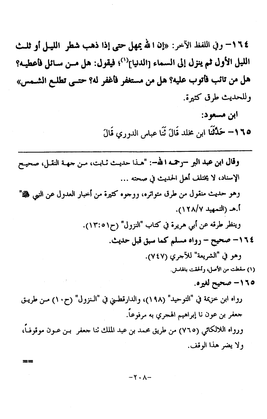 165 - حَدَّثَنَا ابْنُ مَخْلَدٍ، قَالَ: ثنا عَبَّاسٌ الدُّورِيُّ، قَالَ: -[210]- ثنا جَعْفَرُ بْنُ عَوْنٍ، قَالَ: ثنا إِبْرَاهِيمُ الْهَجَرِيُّ، عَنْ أَبِي الْأَحْوَصِ، عَنِ ابْنِ مَسْعُودٍ، قَالَ: قَالَ رَسُولُ اللَّهِ صَلَّى اللَّهُ عَلَيْهِ وَسَلَّمَ: " §يَهْبِطُ اللَّهُ إِلَى سَمَاءِ الدُّنْيَا لِثُلُثِ اللَّيْلِ فَيَبْسُطُ يَدَهُ: أَلَا عَبْدٌ يَسْأَلُنِي فَأُعْطِيَهُ، إِلَى صَلَاةِ الْفَجْرِ "