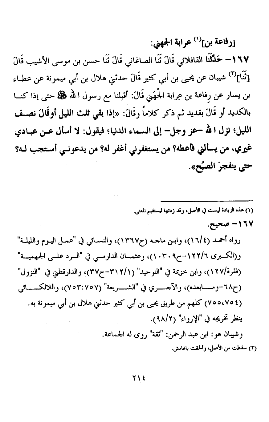 167 - حَدَّثَنَا الْقَافْلَائِي، قَالَ: ثنا الصَّاغَانِيُّ، قَالَ: ثنا حَسَنُ بْنُ مُوسَى الْأَشْيَبُ، قَالَ: ثنا شَيْبَانُ، عَنْ يَحْيَى بْنِ أَبِي كَثِيرٍ، قَالَ: حَدَّثَنِي هِلَالُ بْنُ أَبِي مَيْمُونَةَ، عَنْ عَطَاءِ بْنِ يَسَارٍ، عَنْ رِفَاعَةَ بْنِ عَرَابَةَ الْجُهَنِيِّ، قَالَ: أَقْبَلْنَا مَعَ رَسُولِ اللَّهِ صَلَّى اللَّهُ عَلَيْهِ وَسَلَّمَ حَتَّى إِذَا كُنَّا بِالْكَدِيدِ أَوْ قَالَ: بِقَدِيدٍ ثُمَّ ذَكَرَ كَلَامًا وَقَالَ: «إِذَا بَقِيَ ثُلُثُ اللَّيْلِ» أَوْ قَالَ: " نِصْفُ اللَّيْلِ، §نَزَلَ اللَّهُ عَزَّ وَجَلَّ إِلَى السَّمَاءِ الدُّنْيَا، فَيَقُولُ: لَا أَسْأَلُ عَنْ عِبَادِي غَيْرِي، مَنْ يَسْأَلُنِي فَأُعْطِيَهُ؟ مَنْ يَسْتَغْفِرُنِي أَغْفِرُ لَهُ؟ مِنْ يَدْعُونِي أَسْتَجِبْ لَهُ؟ حَتَّى يَنْفَجِرَ الصُّبْحُ «-[215]-