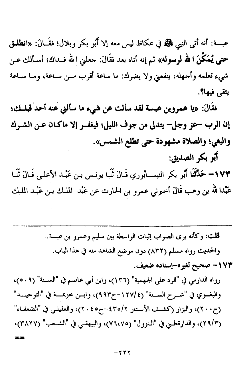 173 - حَدَّثَنَا أَبُو بَكْرٍ النَّيْسَابُورِيُّ قَالَ: ثنا يُونُسُ بْنُ عَبْدِ الْأَعْلَى، قَالَ: ثنا عَبْدُ اللَّهِ بْنُ وَهْبٍ، قَالَ: أَخْبَرَنِي عَمْرُو بْنُ الْحَارِثِ، عَنْ عَبْدِ الْمَلِكِ بْنِ عَبْدِ الْمَلِكِ، -[224]- عَنْ مُصْعَبِ بْنِ أَبِي ذِئْبٍ، عَنِ الْقَاسِمِ بْنِ مُحَمَّدٍ، عَنْ أَبِيهِ، أَوْ عَنْ عَمِّهِ، عَنْ جَدِّهِ أَبِي بَكْرٍ، أَنَّ النَّبِيَّ صَلَّى اللَّهُ عَلَيْهِ وَسَلَّمَ قَالَ: § «إِنَّ اللَّهَ عَزَّ وَجَلَّ يَنْزِلُ إِلَى السَّمَاءِ الدُّنْيَا فِي لَيْلَةِ النِّصْفِ مِنْ شَعْبَانَ، فَيَغْفِرُ فِيهَا لِكُلِّ بَشَرٍ مَا خَلَا كَافِرًا أَوْ رَجُلًا فِي قَلْبِهِ شَحْنَاءُ»