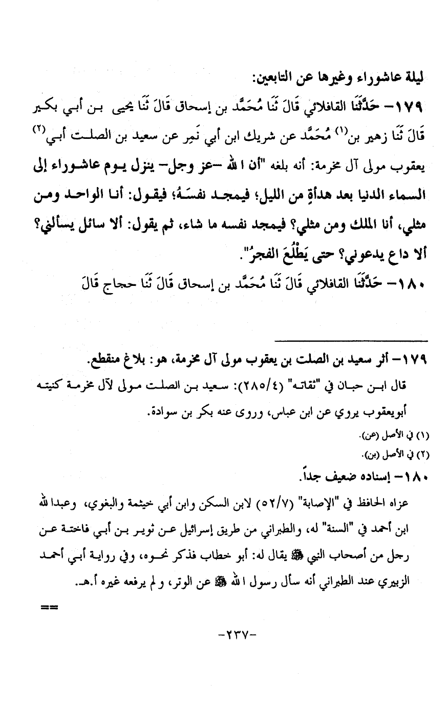 179 - حَدَّثَنَا الْقَافْلَائِيُّ، قَالَ: ثنا مُحَمَّدُ بْنُ إِسْحَاقَ، قَالَ: ثنا يَحْيَى بْنُ أَبِي بُكَيْرٍ، قَالَ: ثنا زُهَيْرُ بْنُ مُحَمَّدٍ، عَنْ شَرِيكِ بْنِ أَبِي نَمِرٍ، عَنْ سَعِيدِ بْنِ الصَّلْتِ أَبِي يَعْقُوبَ، مَوْلَى آلِ مَخْرَمَةَ أَنَّهُ بَلَغَهُ أَنَّ اللَّهَ عَزَّ وَجَلَّ يَنْزِلُ يَوْمَ عَاشُورَاءَ إِلَى السَّمَاءِ الدُّنْيَا بَعْدَ هَدْأَةٍ مِنَ اللَّيْلِ، فَيُمَجِّدُ نَفْسَهُ، فَيَقُولُ: أَنَا الْوَاحِدُ وَمَنْ مِثْلِي؟، أَنَا الْمَلِكُ وَمَنْ مَثَلِي؟ فَيُمَجِّدُ نَفْسَهُ مَا شَاءَ، ثُمَّ يَقُولُ: §أَلَا سَائِلٌ يَسْأَلُنِي؟ أَلَا دَاعٍ يَدْعُونِي؟ حَتَّى يَطْلُعَ الْفَجْرُ "