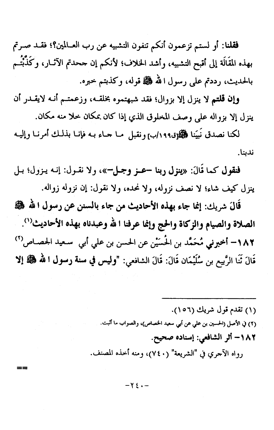 182 - أَخْبَرَنِي مُحَمَّدُ بْنُ الْحُسَيْنِ، عَنِ الْحَسَنِ بْنِ عَلِيٍّ أَبِي سَعِيدٍ الْجَصَّاصِ، قَالَ: ثنا الرَّبِيعُ بْنُ سُلَيْمَانَ، قَالَ: قَالَ الشَّافِعِيُّ: § «وَلَيْسَ فِي سُنَّةِ رَسُولِ اللَّهِ صَلَّى اللَّهُ عَلَيْهِ وَسَلَّمَ إِلَّا -[241]- اتِّبَاعُهَا بِفَرْضِ اللَّهِ، وَالْمَسْأَلَةُ فِي شَيْءٍ قَدْ ثَبَتَتْ فِيهِ السُّنَّةُ لَا يَسَعُ عَالِمًا وَاللَّهُ أَعْلَمُ»