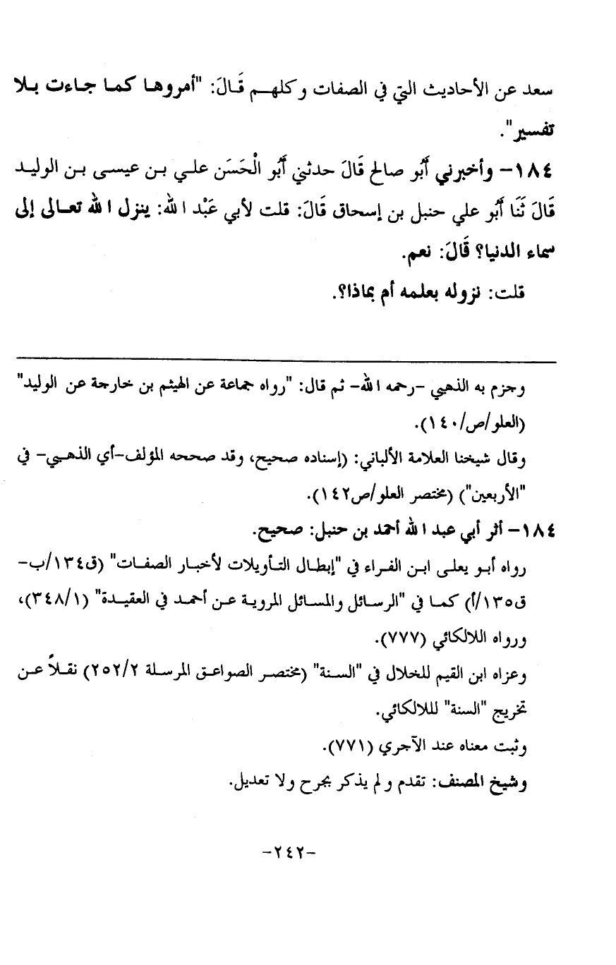 184 - وَأَخْبَرَنِي أَبُو صَالِحٍ، قَالَ: حَدَّثَنِي أَبُو الْحَسَنِ عَلِيُّ بْنُ عِيسَى بْنِ الْوَلِيدِ قَالَ: ثنا أَبُو عَلِيٍّ حَنْبَلُ بْنُ إِسْحَاقَ قَالَ: قُلْتُ لِأَبِي عَبْدِ اللَّهِ: §يَنْزِلُ اللَّهُ تَعَالَى إِلَى سَمَاءِ الدُّنْيَا؟ قَالَ: «نَعَمْ» قُلْتُ: نُزُولُهُ بِعِلْمِهِ أَمْ بِمَاذَا؟ -[243]- قَالَ: فَقَالَ لِي: «اسْكُتْ عَنْ هَذَا» وَغَضِبَ غَضَبًا شَدِيدًا، وَقَالَ: «مَا لَكَ وَلِهَذَا؟ أَمْضِ الْحَدِيثَ كَمَا رُوِيَ بِلَا كَيْفٍ»