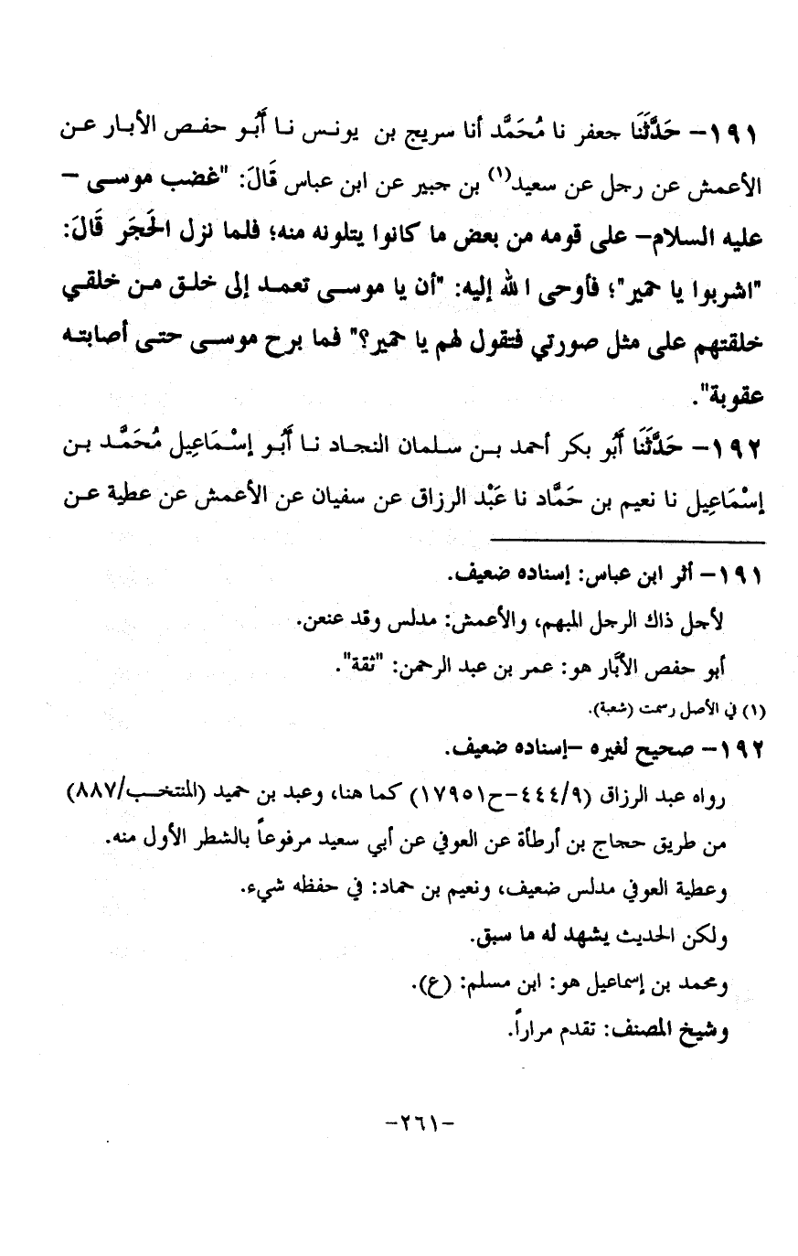 191 - حَدَّثَنَا جَعْفَرٌ، نا مُحَمَّدٌ، أنا سُرَيْجُ بْنُ يُونُسَ، نا أَبُو حَفْصٍ الْأَبَّارُ، عَنِ الْأَعْمَشِ، عَنْ رَجُلٍ، عَنْ سَعِيدِ بْنِ جُبَيْرٍ، عَنِ ابْنِ عَبَّاسٍ، قَالَ: غَضِبَ مُوسَى عَلَيْهِ السَّلَامُ عَلَى قَوْمِهِ مِنْ بَعْضِ مَا كَانُوا يَتْلُونَهُ مِنْهُ فَلَمَّا نَزَلَ الْحَجَرُ قَالَ: «اشْرَبُوا يَا حَمِيرُ» فَأَوْحَى اللَّهُ إِلَيْهِ: " أَنْ يَا مُوسَى §تَعَمِدُ إِلَى خَلْقٍ مِنْ خَلْقِي خَلَقْتُهُمْ عَلَى مِثْلِ صُورَتِي فَتَقُولُ لَهُمْ: يَا حَمِيرُ؟ " فَمَا بَرِحَ مُوسَى حَتَّى أَصَابَتْهُ عُقُوبَةٌ