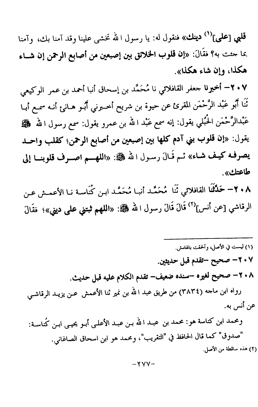 208 - حَدَّثَنَا الْقَافْلَائِيُّ، ثنا مُحَمَّدٌ، أنبا مُحَمَّدُ بْنُ كُنَاسَةَ، نا الْأَعْمَشُ، عَنِ الرَّقَاشِيِّ، عَنْ أَنَسٍ، قَالَ: قَالَ رَسُولُ اللَّهِ صَلَّى اللَّهُ عَلَيْهِ وَسَلَّمَ: «اللَّهُمَّ ثَبِّتْنِي عَلَى دِينِي»، فَقَالَ -[278]- لَهُ أَهْلُهُ: أَتَخَافُ عَلَيْنَا يَا رَسُولَ اللَّهِ وَقَدْ آمَنَّا بِكَ، وَبِمَا جِئْتَ بِهِ؟، فَقَالَ: § «إِنَّ الْقَلْبَ بَيْنَ إِصْبَعَيْنِ مِنْ أَصَابِعِ الرَّحْمَنِ يُقَلِّبُهُ»