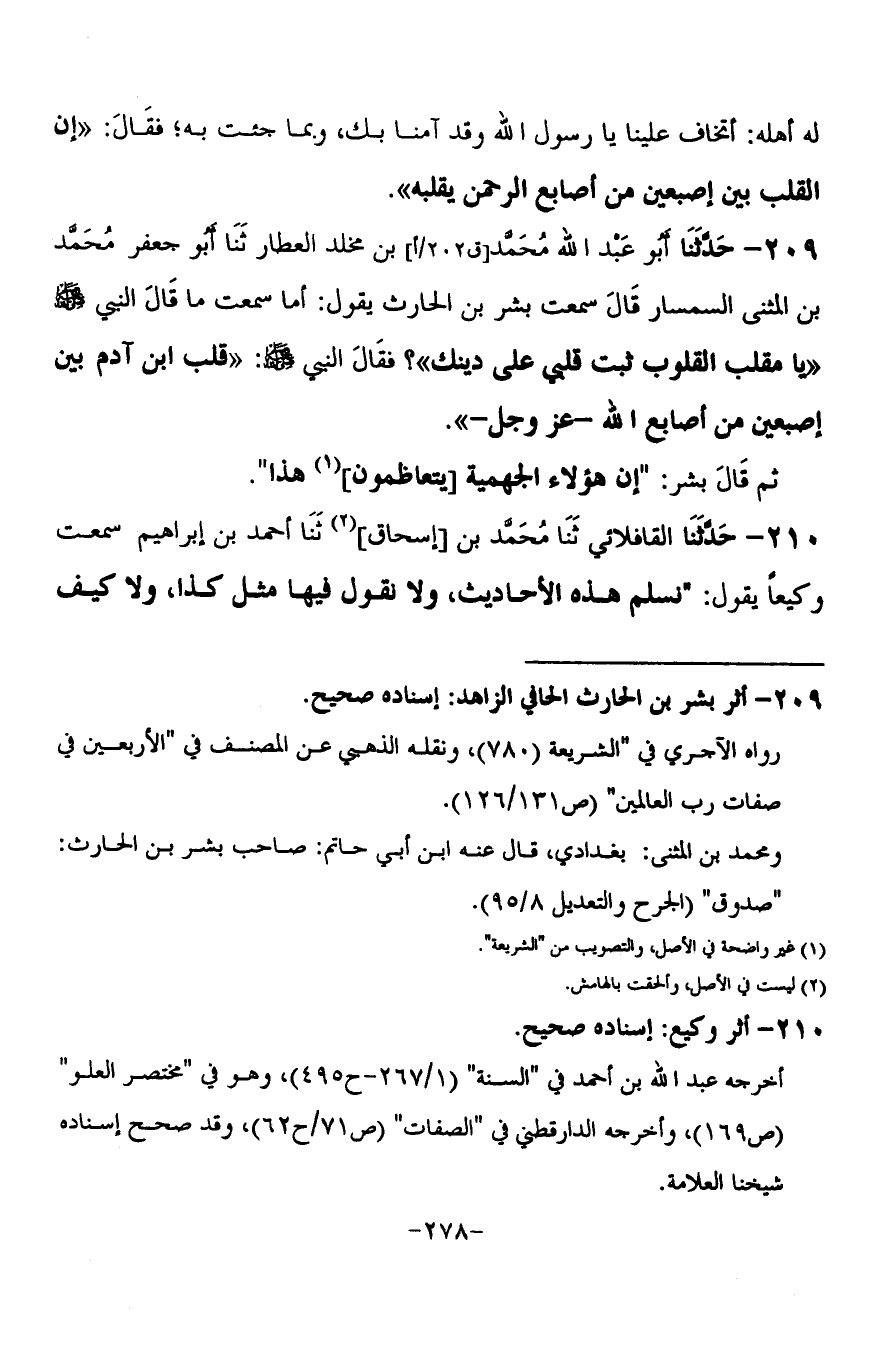 209 - حَدَّثَنَا أَبُو عَبْدِ اللَّهِ مُحَمَّدُ بْنُ مَخْلَدٍ الْعَطَّارُ ثنا أَبُو جَعْفَرٍ مُحَمَّدُ بْنُ الْمُثَنَّى السِّمْسَارُ قَالَ: سَمِعْتُ بِشْرَ بْنَ الْحَارِثِ، يَقُولُ: أَمَا سَمِعْتَ مَا قَالَ النَّبِيُّ صَلَّى اللَّهُ عَلَيْهِ وَسَلَّمَ: «يَا مُقَلِّبَ الْقُلُوبِ ثَبِّتْ قَلْبِي عَلَى دِينِكَ»؟ فَقَالَ النَّبِيُّ صَلَّى اللَّهُ عَلَيْهِ وَسَلَّمَ: § «قَلْبُ ابْنِ آدَمَ بَيْنَ إِصْبَعَيْنِ مِنْ أَصَابِعِ اللَّهِ عَزَّ وَجَلَّ» ثُمَّ قَالَ بِشْرٌ: إِنَّ هَؤُلَاءِ الْجَهْمِيَّةَ يَتَعَاظَمُونَ هَذَا