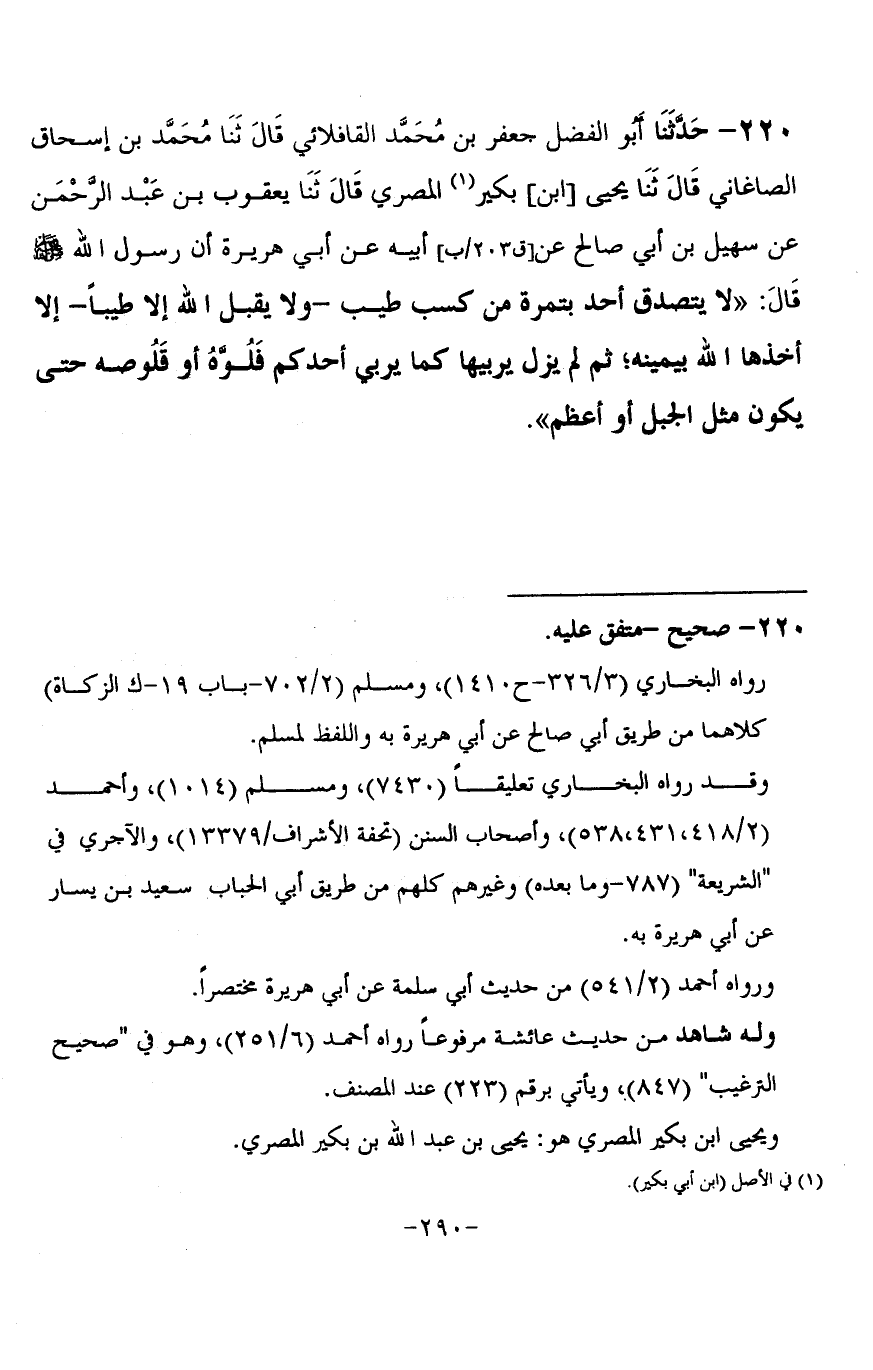 220 - حَدَّثَنَا أَبُو الْفَضْلِ جَعْفَرُ بْنُ مُحَمَّدٍ الْقَافْلَائِي قَالَ: ثنا مُحَمَّدُ بْنُ إِسْحَاقَ الصَّاغَانِيُّ قَالَ: ثنا يَحْيَى بْنُ بُكَيْرٍ الْمِصْرِيُّ، قَالَ: ثنا يَعْقُوبُ بْنُ عَبْدِ الرَّحْمَنِ، عَنْ سُهَيْلِ بْنِ أَبِي صَالِحٍ، عَنْ أَبِيهِ، عَنْ أَبِي هُرَيْرَةَ، أَنَّ رَسُولَ اللَّهِ صَلَّى اللَّهُ عَلَيْهِ وَسَلَّمَ قَالَ: «§لَا يَتَصَدَّقُ أَحَدٌ بِتَمْرَةٍ مِنْ كَسْبٍ طَيِّبٍ، وَلَا يَقْبَلُ اللَّهُ إِلَّا طَيِّبًا، إِلَّا أَخَذَهَا اللَّهُ بِيَمِينِهِ ثُمَّ لَمْ يَزَلْ يُرَبِّيهَا كَمَا يُرَبِّي أَحَدُكُمْ فَلُوَّهُ أَوْ قَلُوصَهُ حَتَّى يَكُونَ مِثْلَ الْجَبَلِ أَوْ أَعْظَمَ» -[291]-