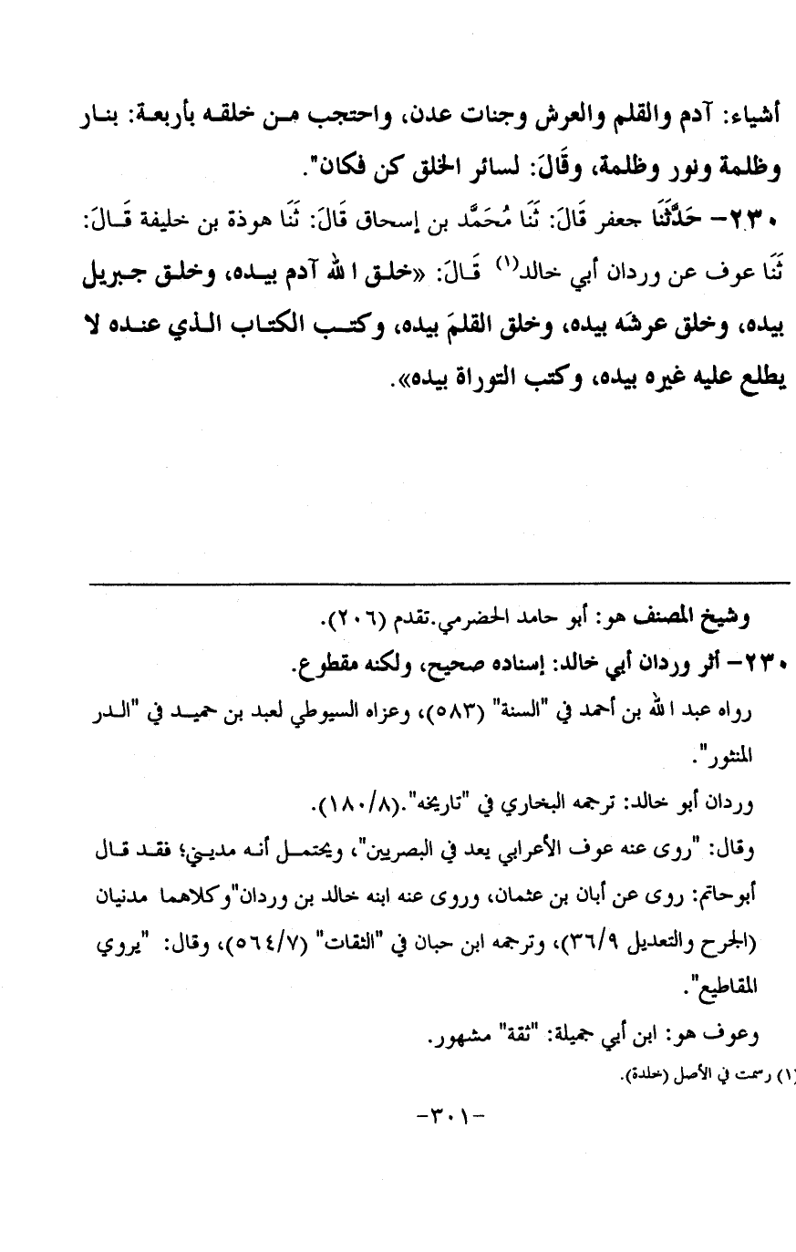 230 - حَدَّثَنَا جَعْفَرٌ، قَالَ: ثنا مُحَمَّدُ بْنُ إِسْحَاقَ، قَالَ: ثنا هَوْذَةُ بْنُ خَلِيفَةَ، قَالَ: ثنا عَوْفٌ، عَنْ وَرْدَانَ أَبِي خَالِدٍ، قَالَ: «§خَلَقَ اللَّهُ آدَمَ بِيَدِهِ، وَخَلَقَ جِبْرِيلَ بِيَدِهِ، وَخَلَقَ عَرْشَهُ بِيَدِهِ، وَخَلَقَ الْقَلَمَ بِيَدِهِ، وَكَتَبَ الْكِتَابَ الَّذِي عِنْدَهُ لَا يَطَّلِعُ عَلَيْهِ غَيْرُهُ بِيَدِهِ، وَكَتَبَ التَّوْرَاةَ بِيَدِهِ»