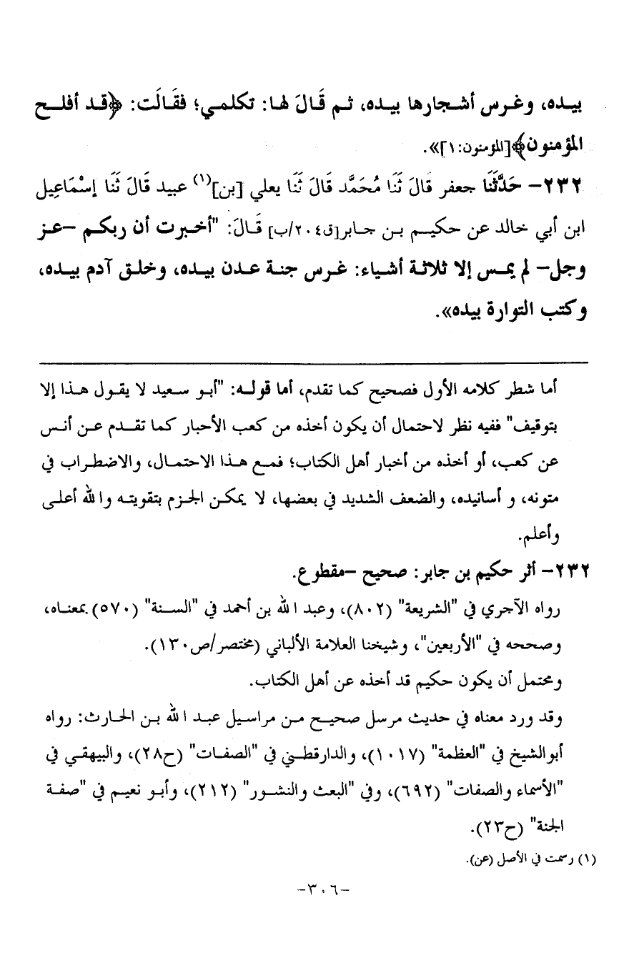 232 - حَدَّثَنَا جَعْفَرٌ، قَالَ: ثنا مُحَمَّدٌ، قَالَ: ثنا يَعْلَى بْنُ عُبَيْدٍ، قَالَ: ثنا إِسْمَاعِيلُ بْنُ أَبِي خَالِدٍ، عَنْ حَكِيمِ بْنِ جَابِرٍ، قَالَ: " أُخْبِرْتُ أَنَّ رَبَّكُمْ عَزَّ وَجَلَّ لَمْ يَمَسَّ إِلَّا ثَلَاثَةَ أَشْيَاءَ: §غَرَسَ جَنَّةَ عَدْنٍ بِيَدِهِ، وَخَلَقَ آدَمَ بِيَدِهِ، وَكَتَبَ التَّوْرَاةَ بِيَدِهِ -[307]-