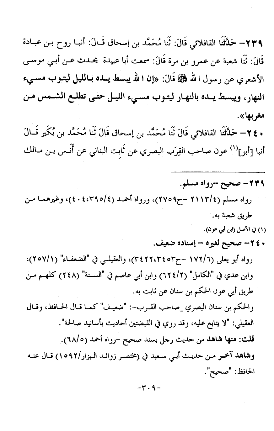 239 - حَدَّثَنَا الْقَافْلَائِيُّ، قَالَ: ثنا مُحَمَّدُ بْنُ إِسْحَاقَ، قَالَ: أنبا رَوْحُ بْنُ عُبَادَةَ، قَالَ: ثنا شُعْبَةُ، عَنْ عَمْرِو بْنِ مُرَّةَ، قَالَ: سَمِعْتُ أَبَا عُبَيْدَةَ، يُحَدِّثُ عَنْ أَبِي مُوسَى الْأَشْعَرِيِّ، عَنْ رَسُولِ اللَّهِ صَلَّى اللَّهُ عَلَيْهِ وَسَلَّمَ قَالَ: «§إِنَّ اللَّهَ يَبْسُطُ يَدَهُ بِاللَّيْلِ لِيَتُوبَ مُسِيءُ النَّهَارِ، وَيَبْسُطُ يَدَهُ بِالنَّهَارِ لِيَتُوبَ مُسِيءُ اللَّيْلِ حَتَّى تَطْلُعَ الشَّمْسُ مِنْ مَغْرِبِهَا»
