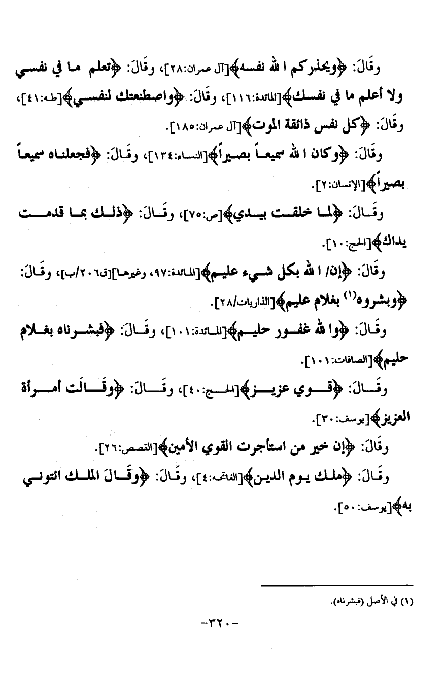 وَقَالَ {وَيُحَذِّرُكُمُ اللَّهُ نَفْسَهُ} [آل عمران: 28] وَقَالَ: {تَعْلَمُ مَا فِي نَفْسِي وَلَا أَعْلَمُ مَا فِي نَفْسِكَ} [المائدة: 116]، وَقَالَ: {وَاصْطَنَعْتُكَ لِنَفْسِي} [طه: 41]، وَقَالَ: {كُلُّ نَفْسٍ ذَائِقَةُ الْمَوْتِ} [آل عمران: 185]، وَقَالَ: {وَكَانَ اللَّهُ سَمِيعًا بَصِيرًا} [النساء: 134]، وَقَالَ: {فَجَعَلْنَاهُ سَمِيعًا بَصِيرًا} [الإنسان: 2]، وَقَالَ: {لِمَا خَلَقْتُ بِيَدَيَّ} [ص: 75]، وَقَالَ: {ذَلِكَ بِمَا قَدَّمَتْ يَدَاكَ} [الحج: 10]، وَقَالَ: {إِنَّ اللَّهَ بِكُلِّ شَيْءٍ عَلِيمٌ} [الأنفال: 75]، وَقَالَ: {وَبَشَّرُوهُ بِغُلَامٍ عَلِيمٍ} [الذاريات: 28]، وَقَالَ: {وَاللَّهُ غَفُورٌ حَلِيمٌ} [البقرة: 225]، وَقَالَ: {فَبَشَّرْنَاهُ بِغُلَامٍ حَلِيمٍ} [الصافات: 101]، وَقَالَ: {قَوِيٌّ عَزِيزٌ} [الحديد: 25]، وَقَالَ: {قَالَتِ امْرَأَةُ الْعَزِيزِ} [يوسف: 51]، وَقَالَ: {إِنَّ خَيْرَ مَنِ اسْتَأْجَرْتَ الَقْوِيُّ الْأَمِينُ} [القصص: 26]، وَقَالَ: (مَلِكُ يَوْمِ الدِّينِ)، وَقَالَ، {وَقَالَ الْمَلِكُ ائْتُونِي بِهِ} [يوسف: 50]،