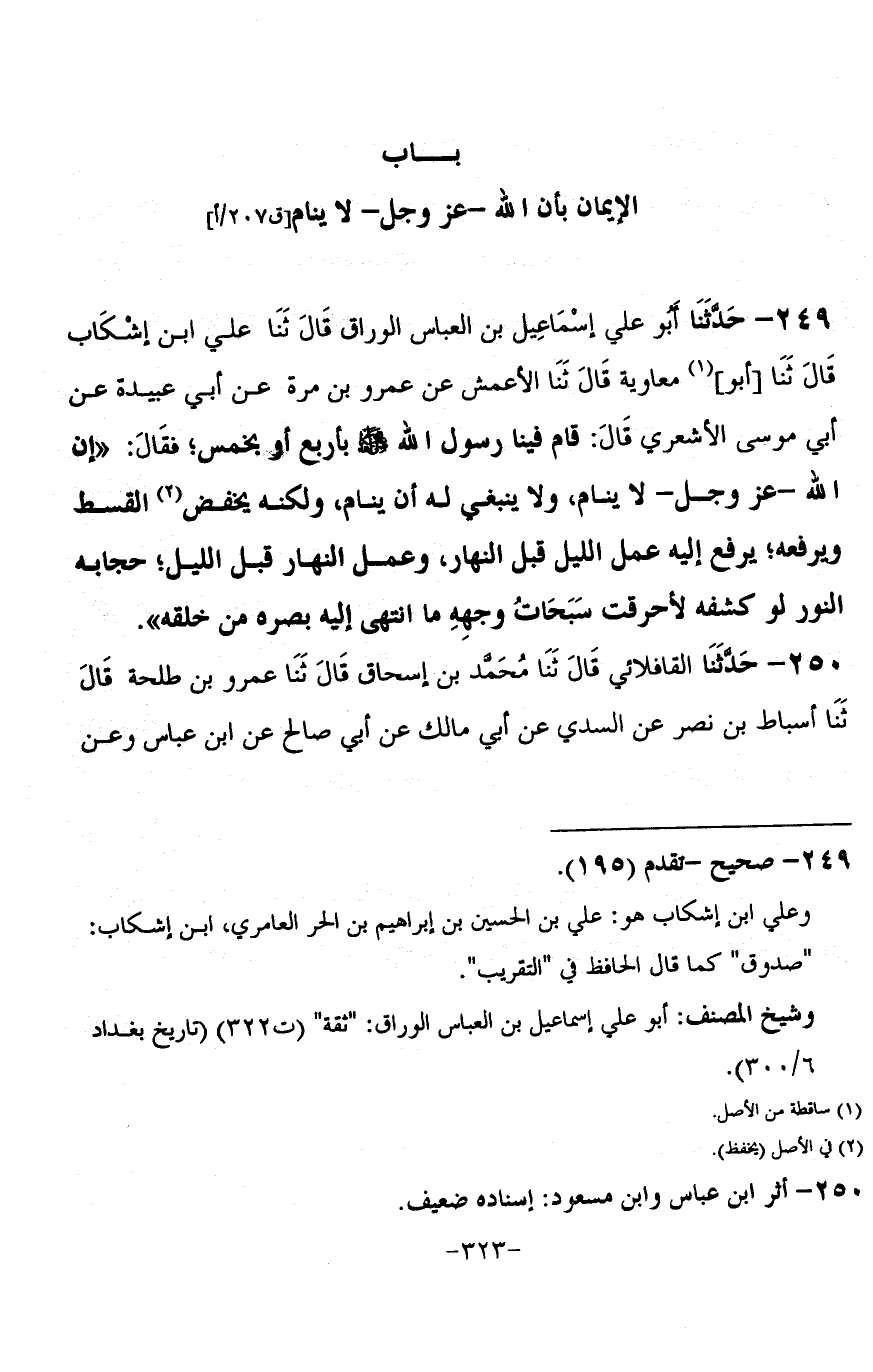 249 - حَدَّثَنَا أَبُو عَلِيٍّ إِسْمَاعِيلُ بْنُ الْعَبَّاسِ الْوَرَّاقُ قَالَ: ثنا عَلِيُّ بْنُ إِشْكَابَ، قَالَ: ثنا أَبُو مُعَاوِيَةَ، قَالَ: ثنا الْأَعْمَشُ، عَنْ عَمْرِو بْنِ مُرَّةَ، عَنْ أَبِي عُبَيْدَةَ، عَنْ أَبِي مُوسَى الْأَشْعَرِيِّ، قَالَ: قَامَ فِينَا رَسُولُ اللَّهِ صَلَّى اللَّهُ عَلَيْهِ وَسَلَّمَ بِأَرْبَعٍ أَوْ بِخَمْسٍ، فَقَالَ: «§إِنَّ اللَّهَ عَزَّ وَجَلَّ لَا يَنَامُ، وَلَا يَنْبَغِي لَهُ أَنْ يَنَامَ، وَلَكِنَّهُ يَخْفِضُ الْقِسْطَ وَيَرْفَعُهُ، يُرْفَعُ إِلَيْهِ عَمَلُ اللَّيْلِ قَبْلَ النَّهَارِ، وَعَمَلُ النَّهَارِ قَبْلَ اللَّيْلِ، حِجَابُهُ النُّورُ لَوْ كَشَفَهُ لَأَحْرَقَتْ سُبُحَاتُ وَجْهِهِ مَا انْتَهَى إِلَيْهِ بَصَرُهُ مِنْ خَلْقِهِ»