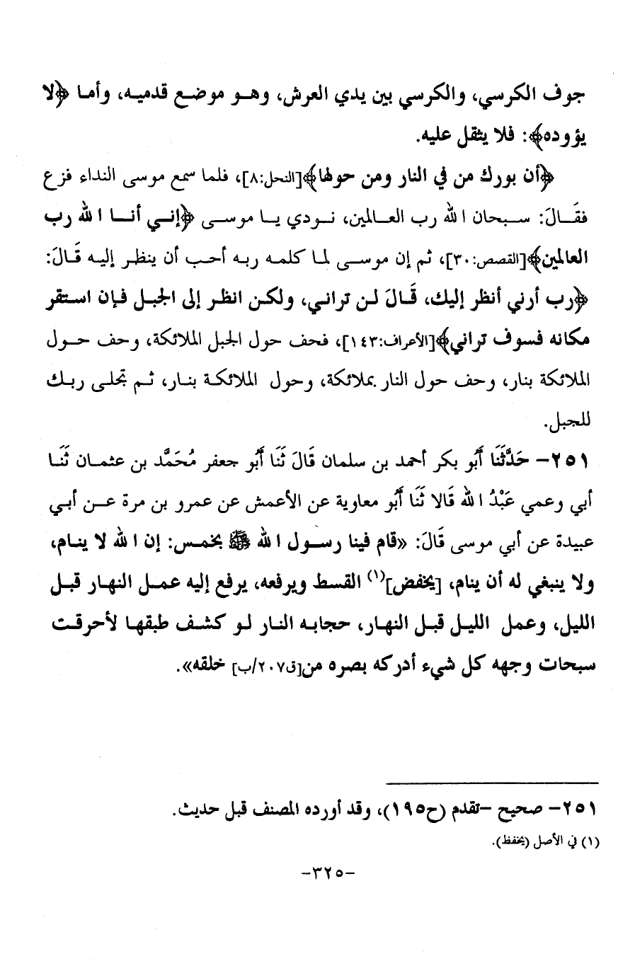 251 - حَدَّثَنَا أَبُو بَكْرٍ أَحْمَدُ بْنُ سَلْمَانَ قَالَ: ثنا أَبُو جَعْفَرٍ مُحَمَّدُ بْنُ عُثْمَانَ، ثنا أَبِي، وَعَمِّي عَبْدُ اللَّهِ، قَالَا: ثنا أَبُو مُعَاوِيَةَ، عَنِ الْأَعْمَشِ، عَنْ عَمْرِو بْنِ مُرَّةَ، عَنْ أَبِي عُبَيْدَةَ، عَنْ أَبِي مُوسَى، قَالَ: قَامَ فِينَا رَسُولُ اللَّهِ صَلَّى اللَّهُ عَلَيْهِ وَسَلَّمَ بِخَمْسٍ: «§إِنَّ اللَّهَ لَا يَنَامُ، وَلَا يَنْبَغِي لَهُ أَنْ يَنَامَ، يَخْفِضُ الْقِسْطَ وَيَرْفَعُهُ، يُرْفَعُ إِلَيْهِ عَمَلُ النَّهَارِ قَبْلَ اللَّيْلِ، وَعَمَلُ اللَّيْلِ قَبْلَ النَّهَارِ، حِجَابُهُ النَّارُ لَوْ كَشَفَ طَبَقَهَا لَأَحْرَقَتْ سُبُحَاتُ وَجْهِهِ كُلَّ شَيْءٍ أَدْرَكَهُ بَصَرُهُ مِنْ خَلْقِهِ»