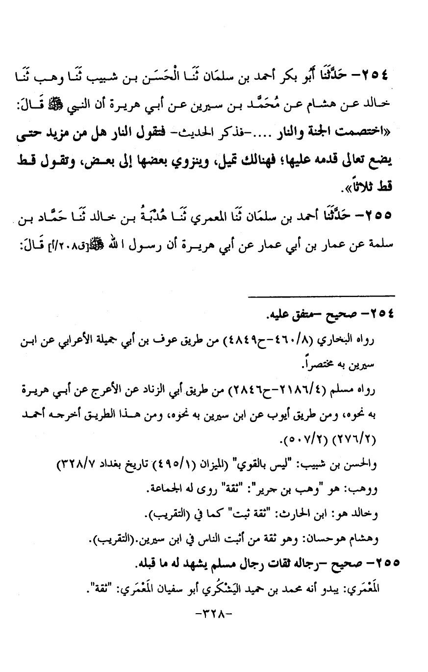 255 - حَدَّثَنَا أَحْمَدُ بْنُ سَلْمَانَ، ثنا الْمَعْمَرِيُّ، ثنا هُدْبَةُ بْنُ خَالِدٍ، ثنا حَمَّادُ بْنُ سَلَمَةَ، عَنْ عَمَّارِ بْنِ أَبِي عَمَّارٍ، عَنْ أَبِي هُرَيْرَةَ، أَنَّ رَسُولَ اللَّهِ صَلَّى اللَّهُ عَلَيْهِ وَسَلَّمَ قَالَ: -[329]- " §يُلْقَى فِي النَّارِ أَهْلُهَا، فَتَقُولُ: هَلْ مِنْ مَزِيدٍ؟ حَتَّى يَأْتِيَهَا اللَّهُ عَزَّ وَجَلَّ، فَيَضَعُ قَدَمَهُ عَلَيْهَا، فَتَقُولُ: قَطٍ قَطٍ "