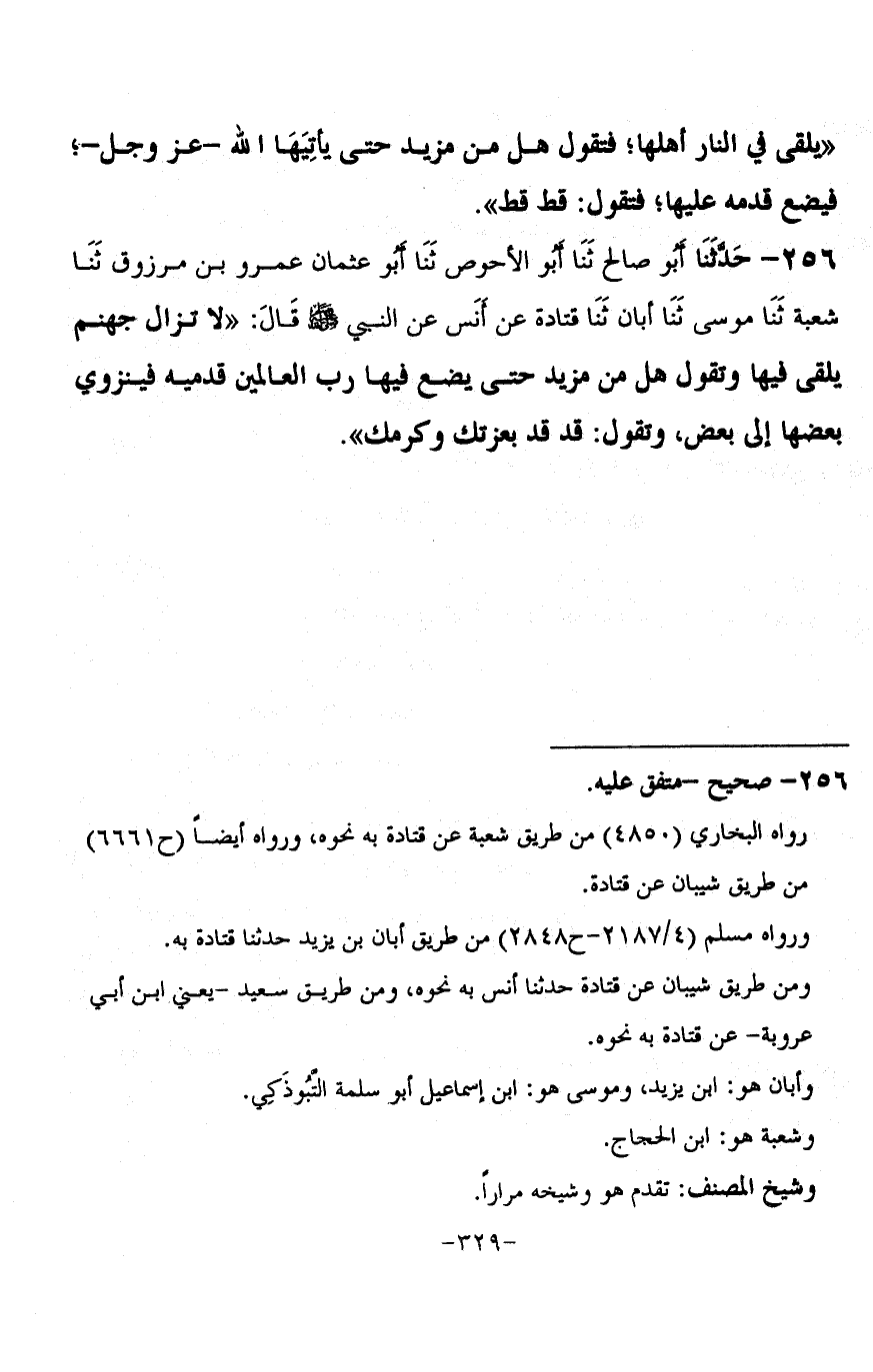256 - حَدَّثَنَا أَبُو صَالِحٍ، ثنا أَبُو الْأَحْوَصِ، ثنا أَبُو عُثْمَانَ عَمْرُو بْنُ مَرْزُوقٍ، ثنا شُعْبَةُ، ثنا مُوسَى، ثنا أَبَانُ، ثنا قَتَادَةُ، عَنْ أَنَسٍ، عَنِ النَّبِيِّ صَلَّى اللَّهُ عَلَيْهِ وَسَلَّمَ قَالَ: " §لَا تَزَالُ جَهَنَّمُ يُلْقَى فِيهَا وَتَقُولُ: هَلْ مِنْ مَزِيدٍ؟ حَتَّى يَضَعَ فِيهَا رَبُّ الْعَالَمِينَ قَدَمَيْهِ فَيَنْزَوِي بَعْضُهَا إِلَى بَعْضٍ، وَتَقُولُ: قَدْ قَدْ بِعِزَّتِكَ وَكَرَمِكَ "