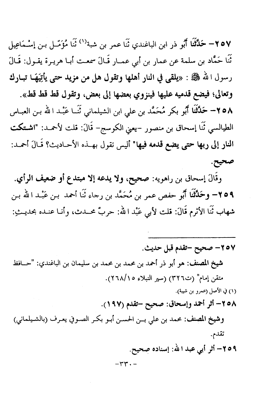 258 - حَدَّثَنَا أَبُو بَكْرٍ مُحَمَّدُ بْنُ عَلِيِّ بْنُ الشَّيْلَمَانِيِّ ثنا عَبْدُ اللَّهِ بْنُ الْعَبَّاسِ الطَّيَالِسِيُّ، ثنا إِسْحَاقُ بْنُ مَنْصُورٍ يَعْنِي الْكَوْسَجَ، قَالَ: قُلْتُ لِأَحْمَدَ: §اشْتَكَتِ النَّارُ إِلَى رَبِّهَا حَتَّى يَضَعَ قَدَمَهُ فِيهَا " أَلَيْسَ تَقُولُ بِهَذِهِ الْأَحَادِيثِ؟، قَالَ أَحْمَدُ: صَحِيحٌ. وَقَالَ إِسْحَاقُ بْنُ رَاهَوَيْهِ: صَحِيحٌ، وَلَا يَدَعُهُ إِلَّا مُبْتَدِعٌ أَوْ ضَعِيفُ الرَّأْيِ