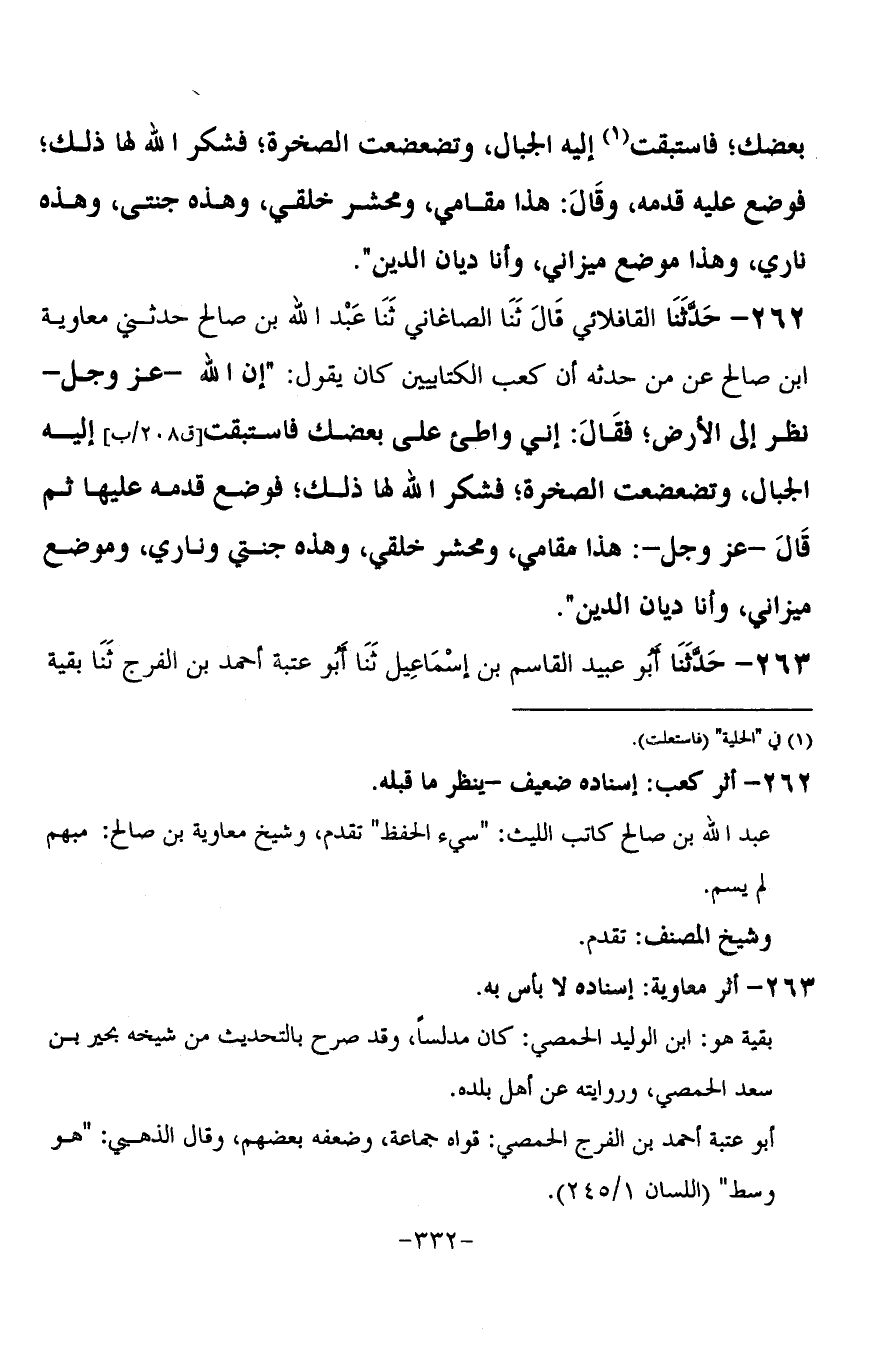 262 - حَدَّثَنَا الْقَافْلَائِيُّ، قَالَ: ثنا الصَّاغَانِيُّ، ثنا عَبْدُ اللَّهِ بْنُ صَالِحٍ، حَدَّثَنِي مُعَاوِيَةُ بْنُ صَالِحٍ، عَمَّنْ حَدَّثَهُ، أَنَّ كَعْبَ الْكِتَابِيِّينَ كَانَ يَقُولُ: §إِنَّ اللَّهَ عَزَّ وَجَلَّ نَظَرَ إِلَى الْأَرْضِ، فَقَالَ: إِنِّي وَاطِئٌ عَلَى بَعْضِكِ، فَاسْتَبَقَتْ إِلَيْهِ الْجِبَالُ، وَتَضَعْضَعَتِ الصَّخْرَةُ، فَشَكَرَ اللَّهُ لَهَا ذَلِكَ، فَوَضَعَ قَدَمَهُ عَلَيْهَا ثُمَّ قَالَ عَزَّ وَجَلَّ: هَذَا مَقَامِي، وَمَحْشَرُ خَلْقِي، وَهَذِهِ جَنَّتِي وَنَارِي، وَمَوْضِعُ مِيزَانِي، وَأَنَا دَيَّانُ الدِّينِ
