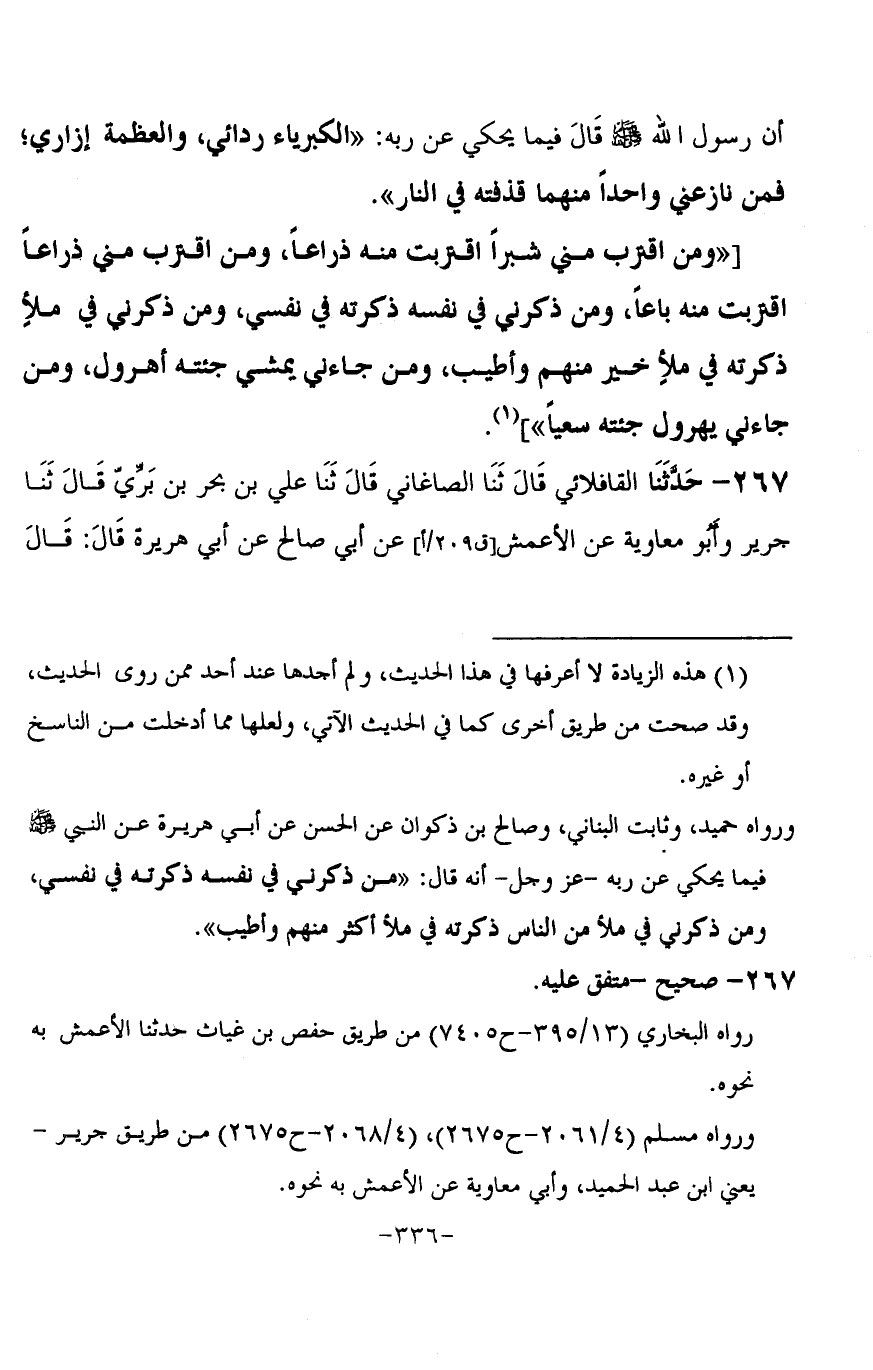 267 - حَدَّثَنَا الْقَافْلَائِيُّ، قَالَ: ثنا الصَّاغَانِيُّ، قَالَ: ثنا عَلِيُّ بْنُ بَحْرِ بْنِ بَرِّيٍّ قَالَ: ثنا جَرِيرٌ، وَأَبُو مُعَاوِيَةَ عَنِ الْأَعْمَشِ، عَنْ أَبِي صَالِحٍ، عَنْ أَبِي هُرَيْرَةَ، قَالَ: قَالَ -[337]- رَسُولُ اللَّهِ صَلَّى اللَّهُ عَلَيْهِ وَسَلَّمَ: «§أَنَا عِنْدَ ظَنِّ عَبْدِي بِي، وَأَنَا مَعَهُ حِينَ يَذْكُرُنِي، فَإِنْ ذَكَرَنِي فِي نَفْسِهِ ذَكَرْتُهُ فِي نَفْسِي، وَإِنْ ذَكَرَنِي فِي مَلَأٍ ذَكَرْتُهُ فِي مَلَأٍ خَيْرٍ مِنْهُمْ، وَإِنِ اقْتَرَبَ إِلَيَّ شِبْرًا اقْتَرَبْتُ إِلَيْهِ ذِرَاعًا، وَإِنِ اقْتَرَبَ إِلَيَّ ذِرَاعًا اقْتَرَبْتُ إِلَيْهِ بَاعًا وَإِنْ أَتَانِي يَمْشِي أَتَيْتُهُ هَرْوَلَةً»