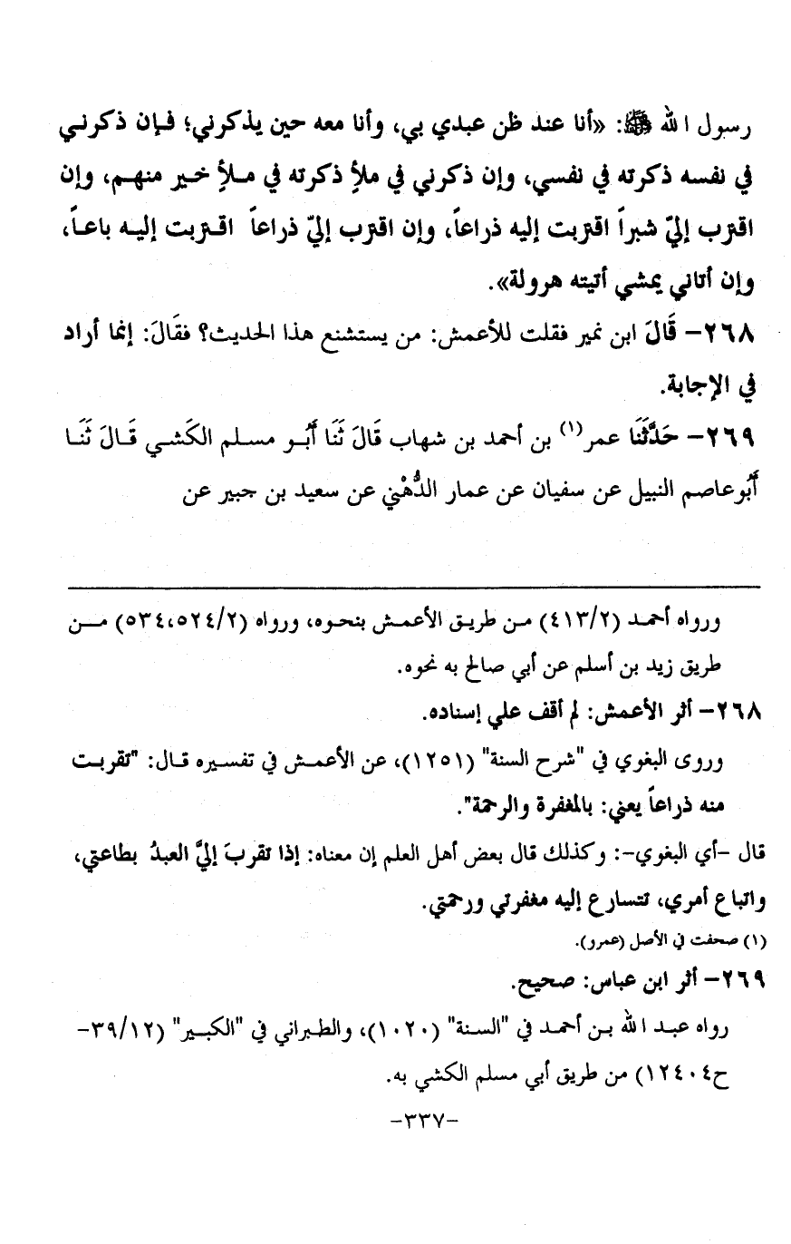 269 - حَدَّثَنَا عُمَرُ بْنُ أَحْمَدَ بْنِ شِهَابٍ، قَالَ: ثنا أَبُو مُسْلِمٍ الْكَشِّيُّ، قَالَ: ثنا أَبُو عَاصِمٍ النَّبِيلُ، عَنْ سُفْيَانَ، عَنْ عَمَّارٍ الدُّهْنِيِّ، عَنْ سَعِيدِ بْنِ جُبَيْرٍ، عَنِ -[339]- ابْنِ عَبَّاسٍ، {§وَسِعَ كُرْسِيُّهُ السَّمَوَاتِ وَالْأَرْضَ}، قَالَ: مَوْضِعُ الْقَدَمَيْنِ، وَلَا يُقَدَّرُ قَدْرُ عَرْشِهِ